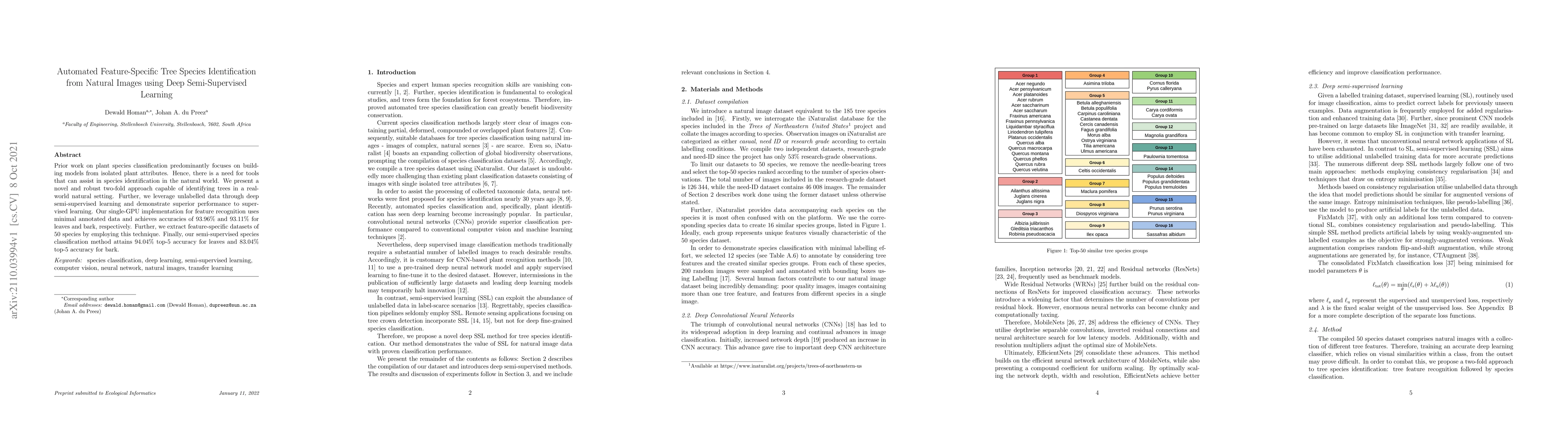 Prior work on plant species classification predominantly focuses on building models from isolated plant attributes. Hence, there is a need for tools that can assist in species identification in the natural world. We present a novel and robust two-fold approach capable of identifying trees in a real-world natural setting. Further, we leverage unlabelled data through deep semi-supervised learning and demonstrate superior performance to supervised learning. Our single-GPU implementation for feature recognition uses minimal annotated data and achieves accuracies of 93.96% and 93.11% for leaves and bark, respectively. Further, we extract feature-specific datasets of 50 species by employing this technique. Finally, our semi-supervised species classification method attains 94.04% top-5 accuracy for leaves and 83.04% top-5 accuracy for bark.