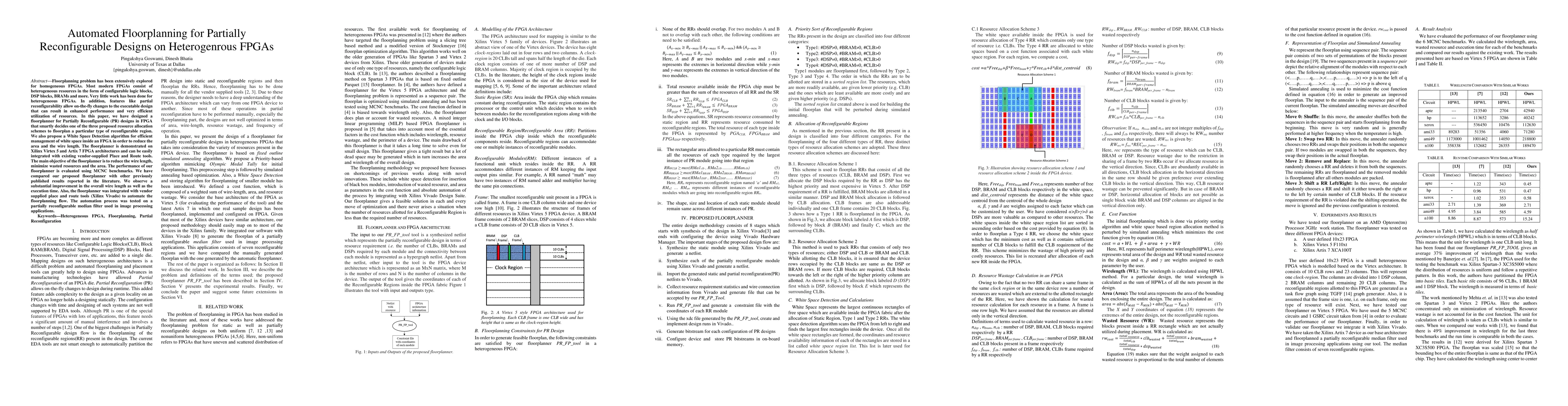 This paper presents an automated floorplanning method for partially reconfigurable designs on heterogeneous FPGAs, proposing three resource allocation schemes and a White Space Detection algorithm to optimize resource utilization, reduce wire length, and minimize wasted area. The method is demonstrated on Xilinx FPGAs and shows significant improvements over existing methods.