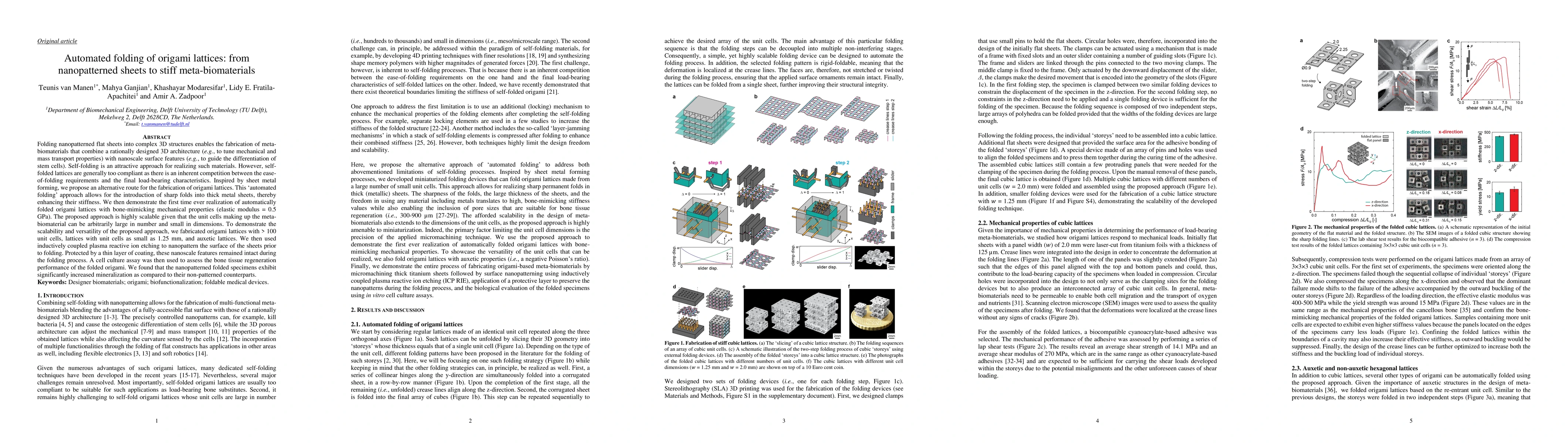 Folding nanopatterned flat sheets into complex 3D structures enables the fabrication of meta-biomaterials that combine a rationally designed 3D architecture (e.g., to tune mechanical and mass transport properties) with nanoscale surface features (e.g., to guide the differentiation of stem cells). Self-folding is an attractive approach for realizing such materials. However, self-folded lattices are generally too compliant as there is an inherent competition between the ease-of-folding requirements and the final load-bearing characteristics. Inspired by sheet metal forming, we propose an alternative route for the fabrication of origami lattices. This automated folding approach allows for the introduction of sharp folds into thick metal sheets, thereby enhancing their stiffness. We then demonstrate the first time ever realization of automatically folded origami lattices with bone-mimicking mechanical properties (elastic modulus = 0.5 GPa). The proposed approach is highly scalable given that the unit cells making up the meta-biomaterial can be arbitrarily large in number and small in dimensions. To demonstrate the scalability and versatility of the proposed approach, we fabricated origami lattices with > 100 unit cells, lattices with unit cells as small as 1.25 mm, and auxetic lattices. We then used inductively coupled plasma reactive ion etching to nanopattern the surface of the sheets prior to folding. Protected by a thin layer of coating, these nanoscale features remained intact during the folding process. A cell culture assay was then used to assess the bone tissue regeneration performance of the folded origami. We found that the nanopatterned folded specimens exhibit significantly increased mineralization as compared to their non-patterned counterparts.