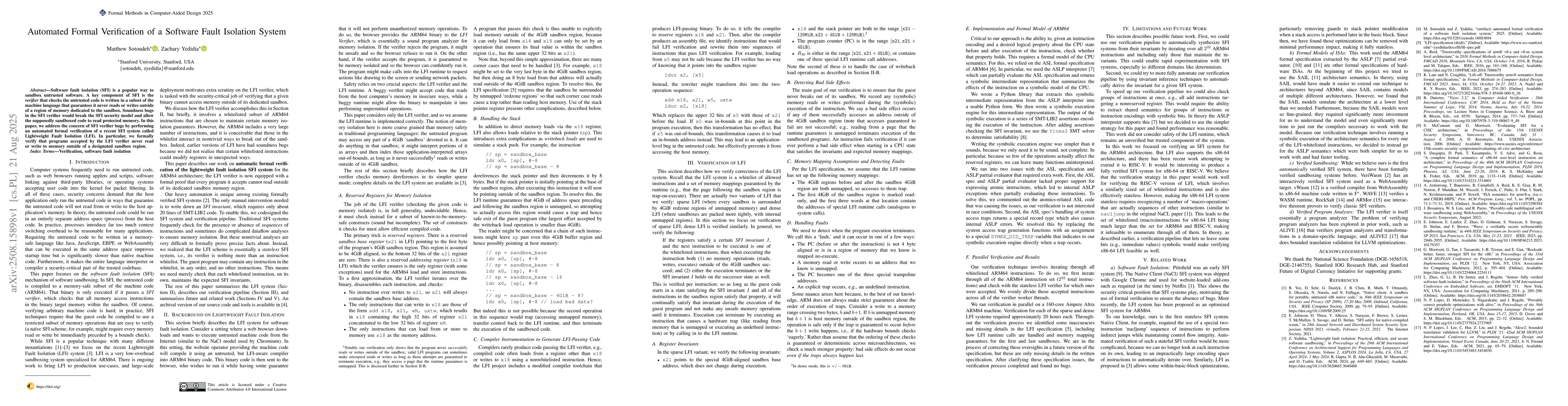 Software fault isolation (SFI) is a popular way to sandbox untrusted software. A key component of SFI is the verifier that checks the untrusted code is written in a subset of the machine language that guarantees it never reads or writes outside of a region of memory dedicated to the sandbox. Soundness bugs in the SFI verifier would break the SFI security model and allow the supposedly sandboxed code to read protected memory. In this paper, we address the concern of SFI verifier bugs by performing an automated formal verification of a recent SFI system called Lightweight Fault Isolation (LFI). In particular, we formally verify that programs accepted by the LFI verifier never read or write to memory outside of a designated sandbox region.