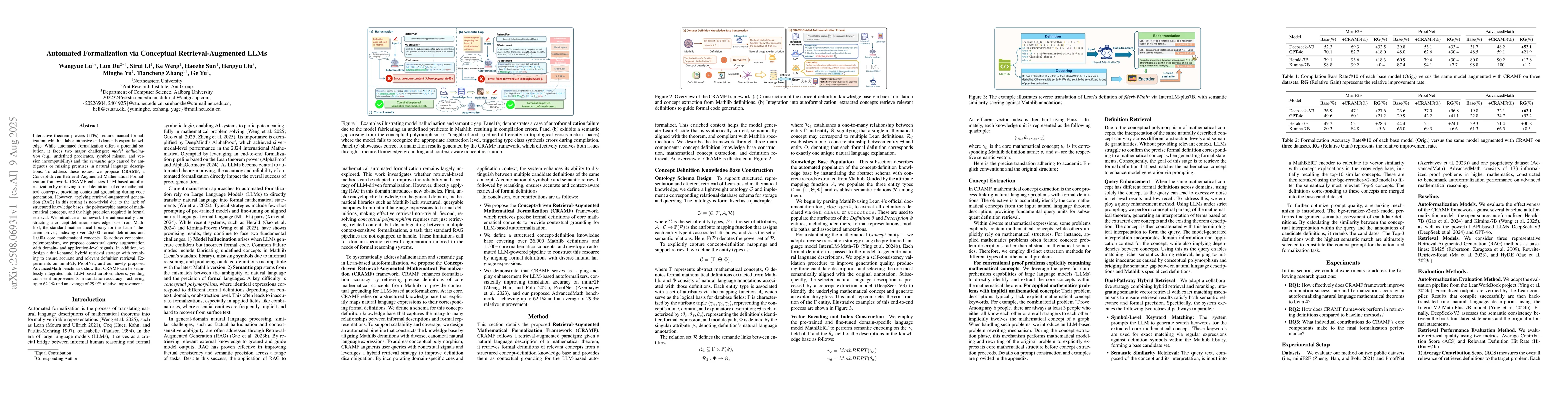 This research introduces CRAMF, a framework that enhances automated mathematical formalization using retrieval-augmented language models. CRAMF addresses challenges like hallucination and semantic gaps by retrieving formal definitions from a concept-definition knowledge base constructed from Mathlib4. It also tackles conceptual polymorphism with contextual query augmentation and a dual-channel hybrid retrieval strategy. Experiments show CRAMF improves translation accuracy by up to 62.1% on various benchmarks.