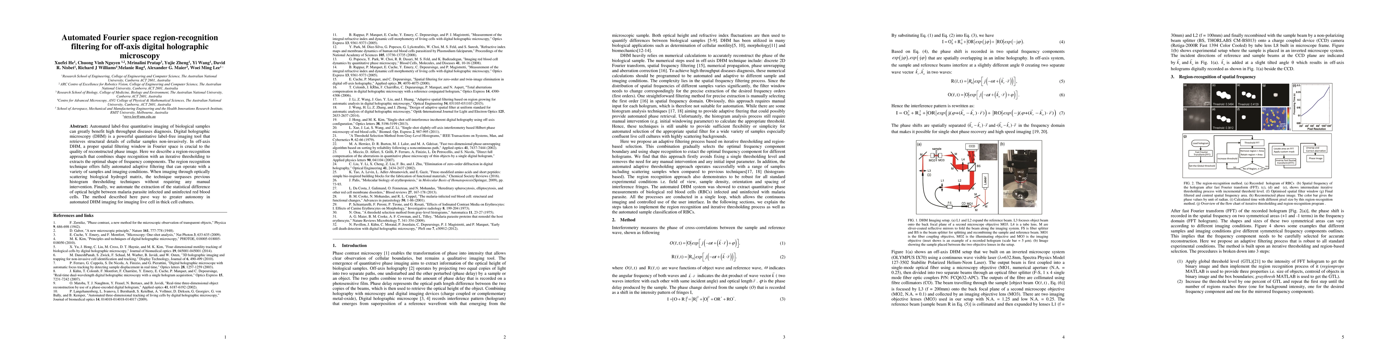 This paper presents an automated Fourier space region-recognition filtering technique for off-axis digital holographic microscopy, enabling label-free quantitative imaging of biological samples. The method provides fully adaptive filtering without manual intervention, significantly improving image quality and facilitating high-throughput disease diagnosis.