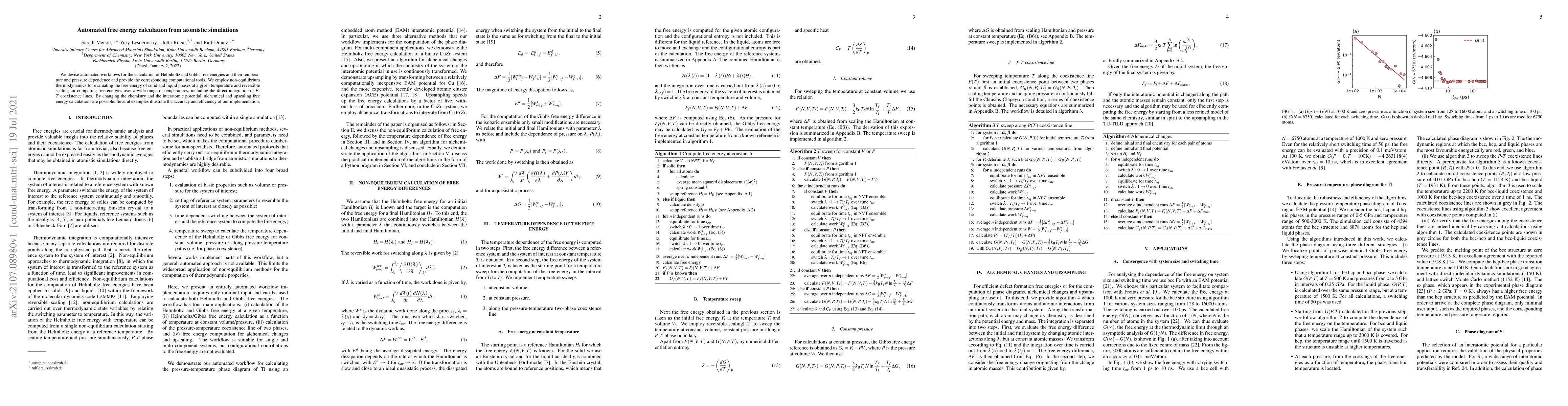 We devise automated workflows for the calculation of Helmholtz and Gibbs free energies and their temperature and pressure dependence and provide the corresponding computational tools. We employ non-equilibrium thermodynamics for evaluating the free energy of solid and liquid phases at a given temperature and reversible scaling for computing free energies over a wide range of temperatures, including the direct integration of $P$-$T$ coexistence lines. By changing the chemistry and the interatomic potential, alchemical and upscaling free energy calculations are possible. Several examples illustrate the accuracy and efficiency of our implementation.