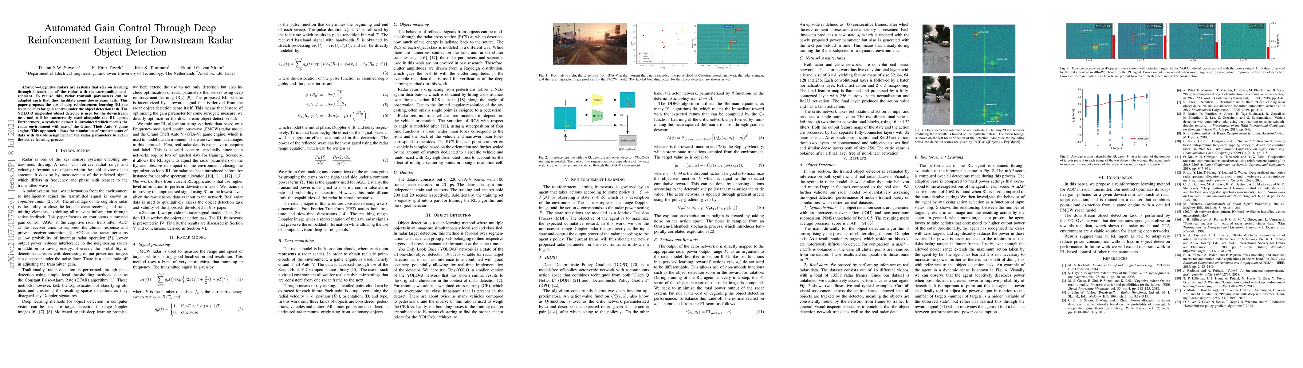 Cognitive radars are systems that rely on learning through interactions of the radar with the surrounding environment. To realize this, radar transmit parameters can be adapted such that they facilitate some downstream task. This paper proposes the use of deep reinforcement learning (RL) to learn policies for gain control under the object detection task. The YOLOv3 single-shot object detector is used for the downstream task and will be concurrently used alongside the RL agent. Furthermore, a synthetic dataset is introduced which models the radar environment with use of the Grand Theft Auto V game engine. This approach allows for simulation of vast amounts of data with flexible assignment of the radar parameters to aid in the active learning process.
