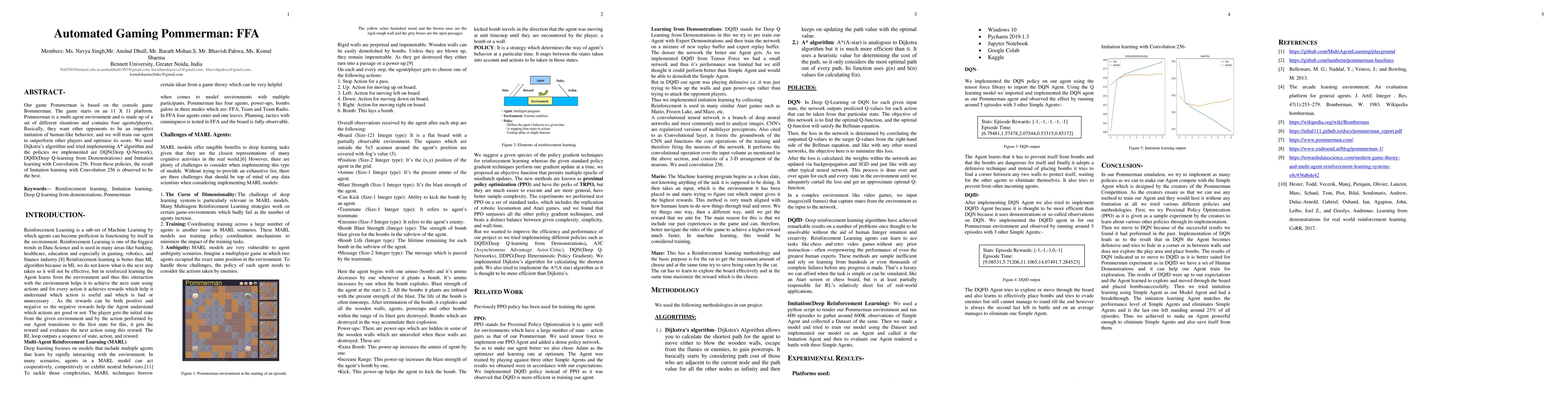 Summary: This paper introduces Pommerman, an automated multi-agent game based on Bommerman, set on an 11x11 platform with four competing agents navigating various scenarios. The focus is on the game's structure and agent interactions.