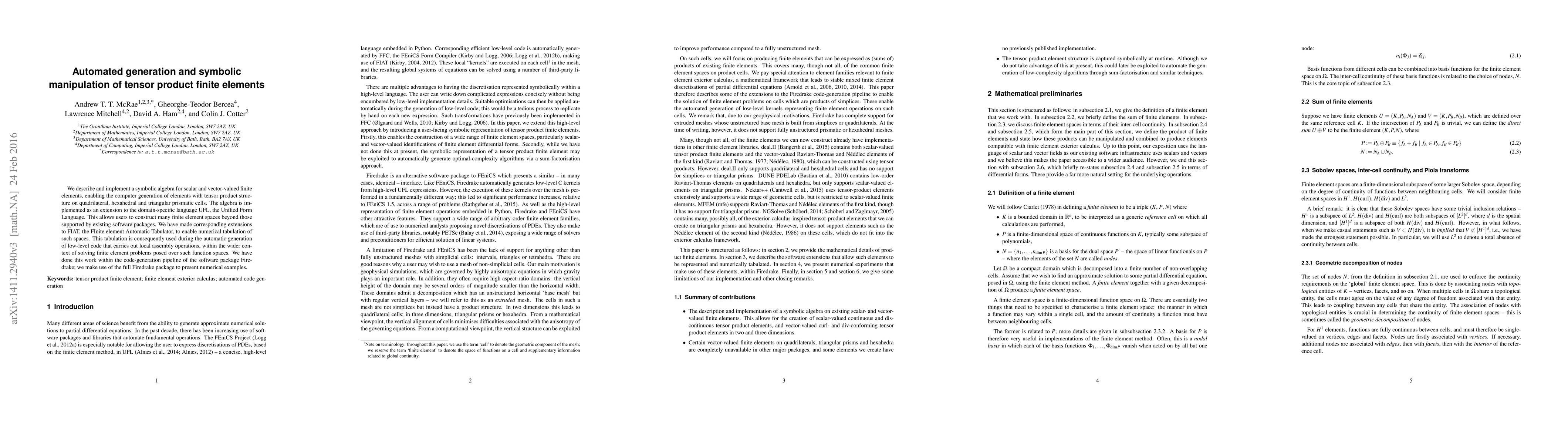 We describe and implement a symbolic algebra for scalar and vector-valued finite elements, enabling the computer generation of elements with tensor product structure on quadrilateral, hexahedral and triangular prismatic cells. The algebra is implemented as an extension to the domain-specific language UFL, the Unified Form Language. This allows users to construct many finite element spaces beyond those supported by existing software packages. We have made corresponding extensions to FIAT, the FInite element Automatic Tabulator, to enable numerical tabulation of such spaces. This tabulation is consequently used during the automatic generation of low-level code that carries out local assembly operations, within the wider context of solving finite element problems posed over such function spaces. We have done this work within the code-generation pipeline of the software package Firedrake; we make use of the full Firedrake package to present numerical examples.