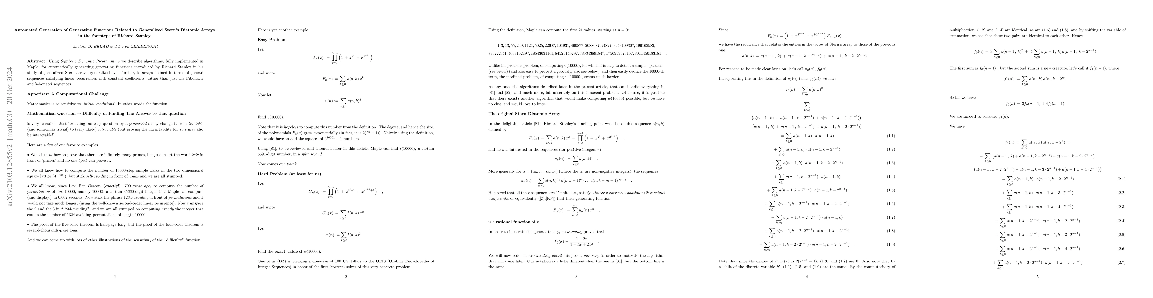 Using Symbolic Dynamic Programming we describe algorithms, fully implemented in Maple, for automatically generating generating functions introduced by Richard Stanley in his study of generalized Stern arrays, generalized even further, to arrays defined in terms of general sequences satisfying linear recurrences with constant coefficients, rather than just the Fibonacci and k-bonacci sequences