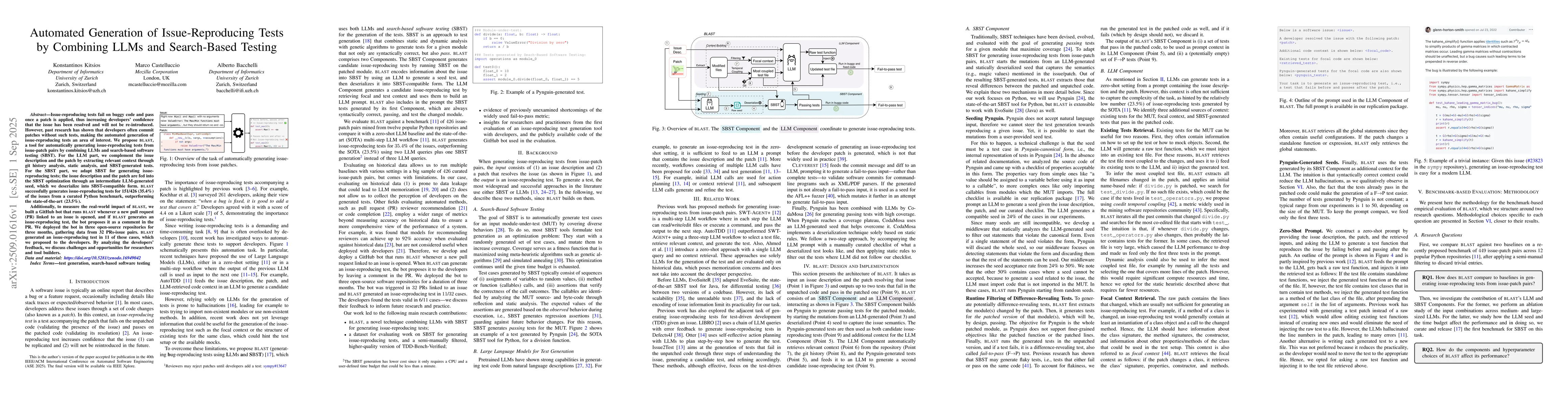 Issue-reproducing tests fail on buggy code and pass once a patch is applied, thus increasing developers' confidence that the issue has been resolved and will not be re-introduced. However, past research has shown that developers often commit patches without such tests, making the automated generation of issue-reproducing tests an area of interest. We propose BLAST, a tool for automatically generating issue-reproducing tests from issue-patch pairs by combining LLMs and search-based software testing (SBST). For the LLM part, we complement the issue description and the patch by extracting relevant context through git history analysis, static analysis, and SBST-generated tests. For the SBST part, we adapt SBST for generating issue-reproducing tests; the issue description and the patch are fed into the SBST optimization through an intermediate LLM-generated seed, which we deserialize into SBST-compatible form. BLAST successfully generates issue-reproducing tests for 151/426 (35.4%) of the issues from a curated Python benchmark, outperforming the state-of-the-art (23.5%). Additionally, to measure the real-world impact of BLAST, we built a GitHub bot that runs BLAST whenever a new pull request (PR) linked to an issue is opened, and if BLAST generates an issue-reproducing test, the bot proposes it as a comment in the PR. We deployed the bot in three open-source repositories for three months, gathering data from 32 PRs-issue pairs. BLAST generated an issue-reproducing test in 11 of these cases, which we proposed to the developers. By analyzing the developers' feedback, we discuss challenges and opportunities for researchers and tool builders. Data and material: https://doi.org/10.5281/zenodo.16949042