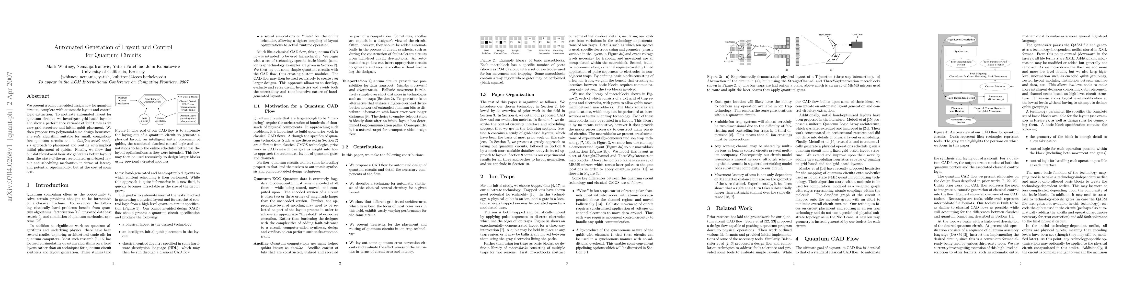 We present a computer-aided design flow for quantum circuits, complete with automatic layout and control logic extraction. To motivate automated layout for quantum circuits, we investigate grid-based layouts and show a performance variance of four times as we vary grid structure and initial qubit placement. We then propose two polynomial-time design heuristics: a greedy algorithm suitable for small, congestion-free quantum circuits and a dataflow-based analysis approach to placement and routing with implicit initial placement of qubits. Finally, we show that our dataflow-based heuristic generates better layouts than the state-of-the-art automated grid-based layout and scheduling mechanism in terms of latency and potential pipelinability, but at the cost of some area.