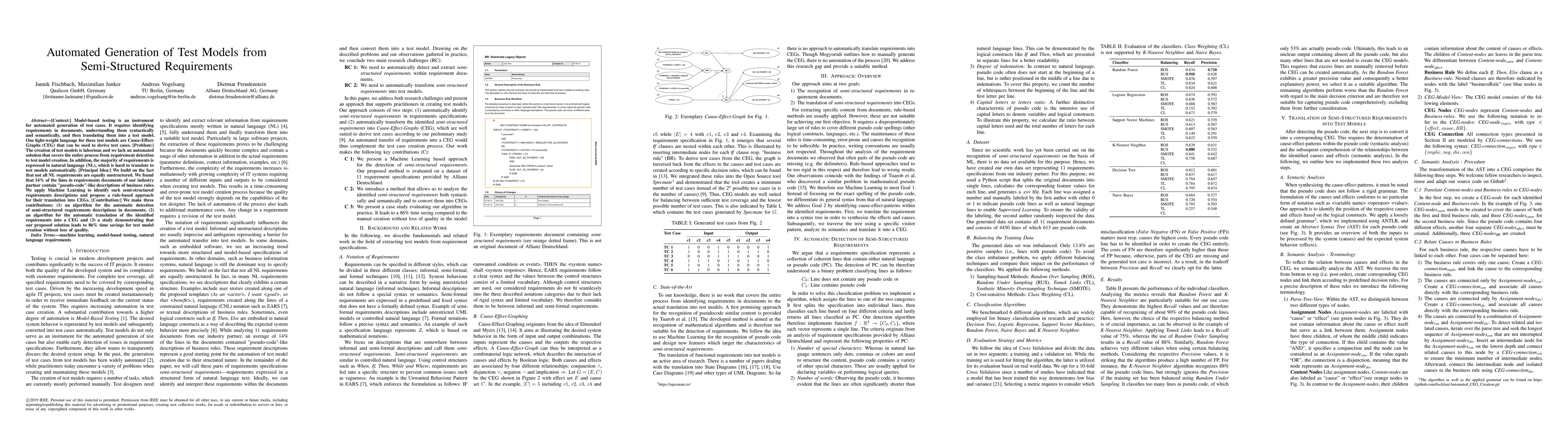 This paper presents an automated method for generating test models from semi-structured requirements using Machine Learning to detect pseudo-code-like descriptions and a rule-based approach to translate them into Cause-Effect-Graphs, achieving 86% time savings in test model creation.