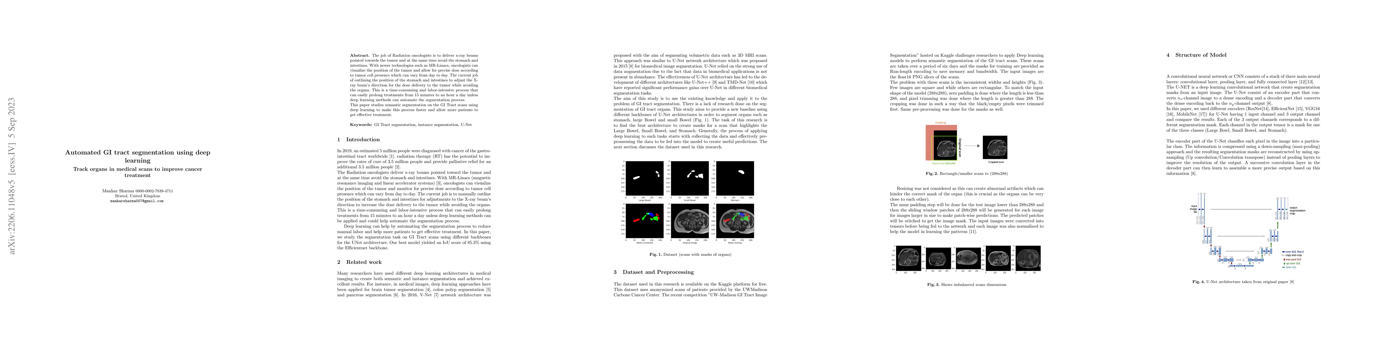 This paper proposes a deep learning method to automate the segmentation of the GI tract, aiming to streamline the process of adjusting X-ray beams for radiation therapy, thereby reducing treatment time and improving patient care.