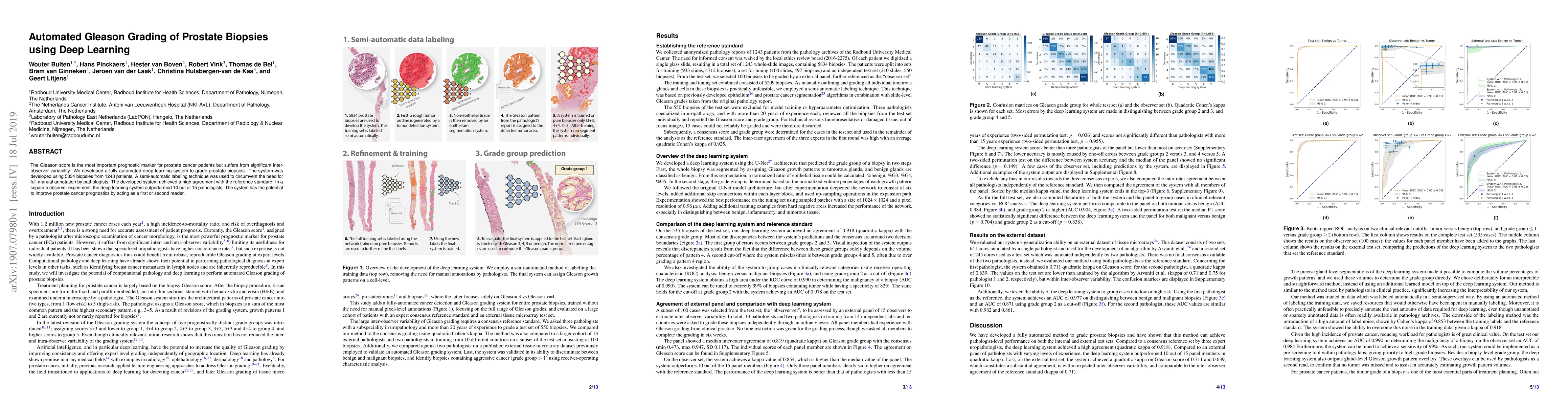 This research developed a fully automated deep learning system to grade prostate biopsies, achieving high agreement with pathologists and outperforming many in a separate observer experiment. The system aims to reduce inter-observer variability and improve prostate cancer prognostics.