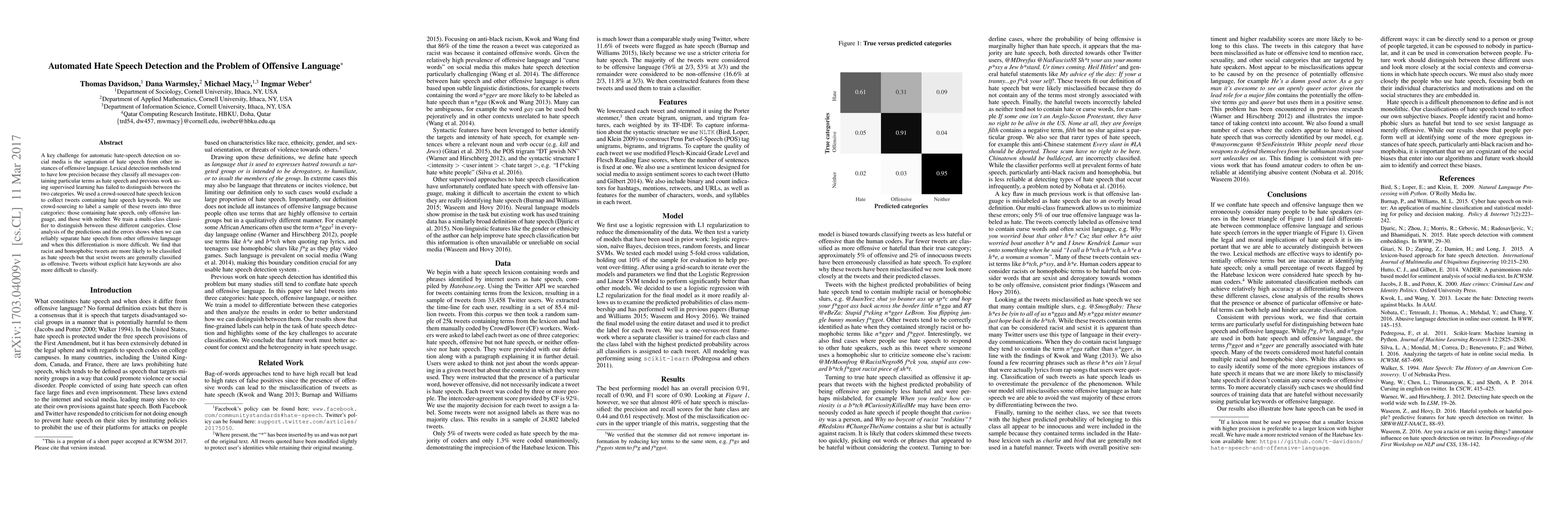 This research explores the challenge of distinguishing hate speech from other offensive language in social media using a crowd-sourced lexicon and multi-class classifier. The study finds that while racist and homophobic tweets are reliably classified as hate speech, sexist tweets are often categorized as offensive, and tweets without explicit hate keywords are difficult to classify.