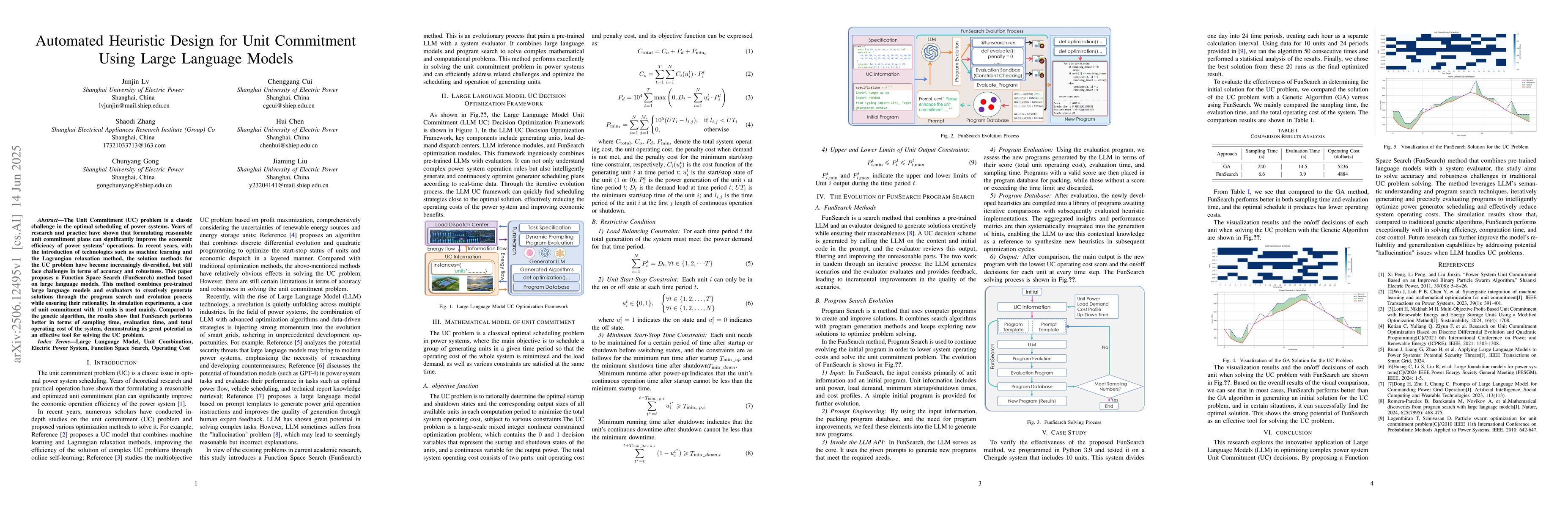 The novelty of this work lies in the integration of large language models with program search and evolution processes for solving complex power system unit commitment problems, offering a promising alternative to traditional optimization methods.