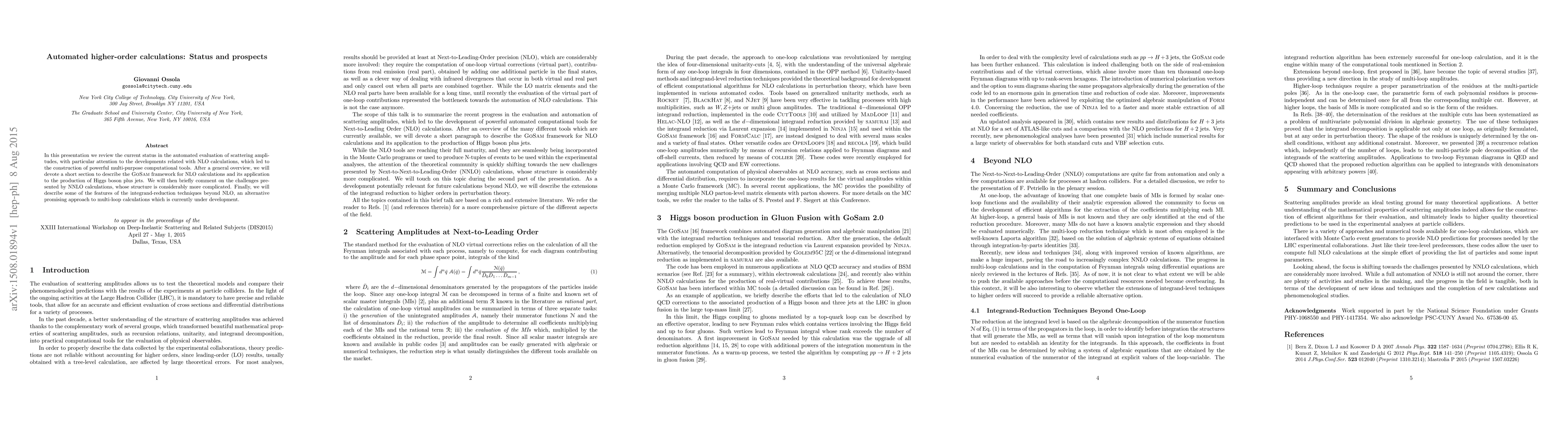 In this presentation we review the current status in the automated evaluation of scattering amplitudes, with particular attention to the developments related with NLO calculations, which led to the construction of powerful multi-purpose computational tools. After a general overview, we will devote a short section to describe the GoSam framework for NLO calculations and its application to the production of Higgs boson plus jets. We will then briefly comment on the challenges presented by NNLO calculations, whose structure is considerably more complicated. Finally, we will describe some of the features of the integrand-reduction techniques beyond NLO, an alternative promising approach to multi-loop calculations which is currently under development.
