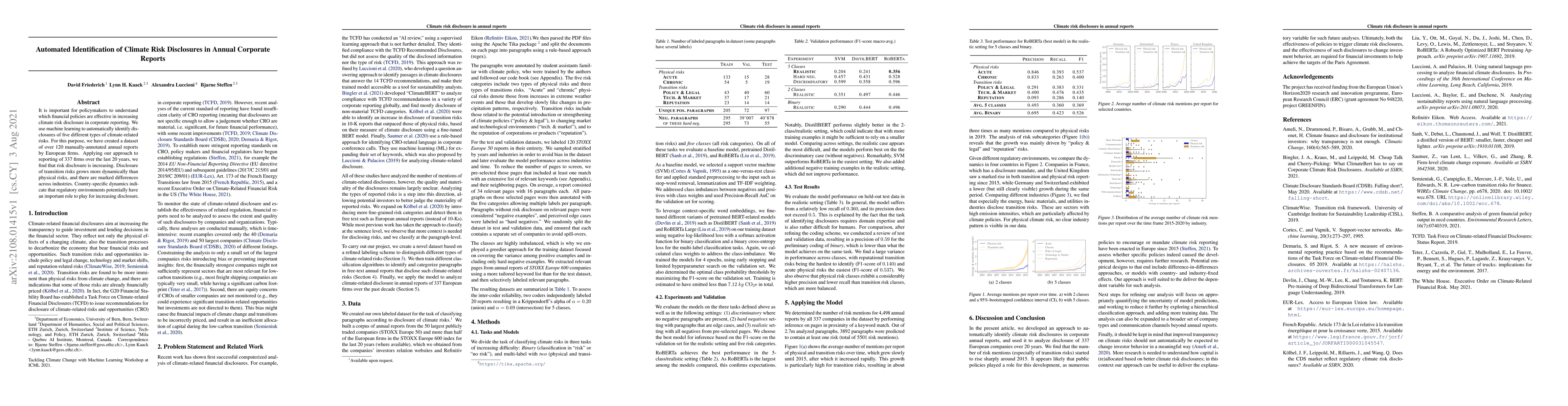 It is important for policymakers to understand which financial policies are effective in increasing climate risk disclosure in corporate reporting. We use machine learning to automatically identify disclosures of five different types of climate-related risks. For this purpose, we have created a dataset of over 120 manually-annotated annual reports by European firms. Applying our approach to reporting of 337 firms over the last 20 years, we find that risk disclosure is increasing. Disclosure of transition risks grows more dynamically than physical risks, and there are marked differences across industries. Country-specific dynamics indicate that regulatory environments potentially have an important role to play for increasing disclosure.