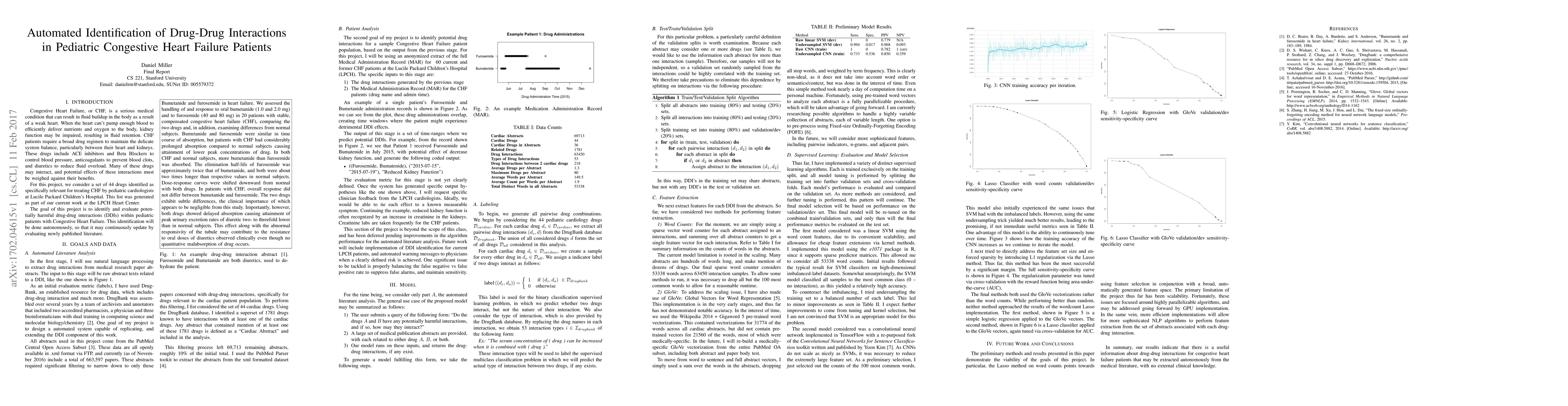 Congestive Heart Failure, or CHF, is a serious medical condition that can result in fluid buildup in the body as a result of a weak heart. When the heart can't pump enough blood to efficiently deliver nutrients and oxygen to the body, kidney function may be impaired, resulting in fluid retention. CHF patients require a broad drug regimen to maintain the delicate system balance, particularly between their heart and kidneys. These drugs include ACE inhibitors and Beta Blockers to control blood pressure, anticoagulants to prevent blood clots, and diuretics to reduce fluid overload. Many of these drugs may interact, and potential effects of these interactions must be weighed against their benefits. For this project, we consider a set of 44 drugs identified as specifically relevant for treating CHF by pediatric cardiologists at Lucile Packard Children's Hospital. This list was generated as part of our current work at the LPCH Heart Center. The goal of this project is to identify and evaluate potentially harmful drug-drug interactions (DDIs) within pediatric patients with Congestive Heart Failure. This identification will be done autonomously, so that it may continuously update by evaluating newly published literature.