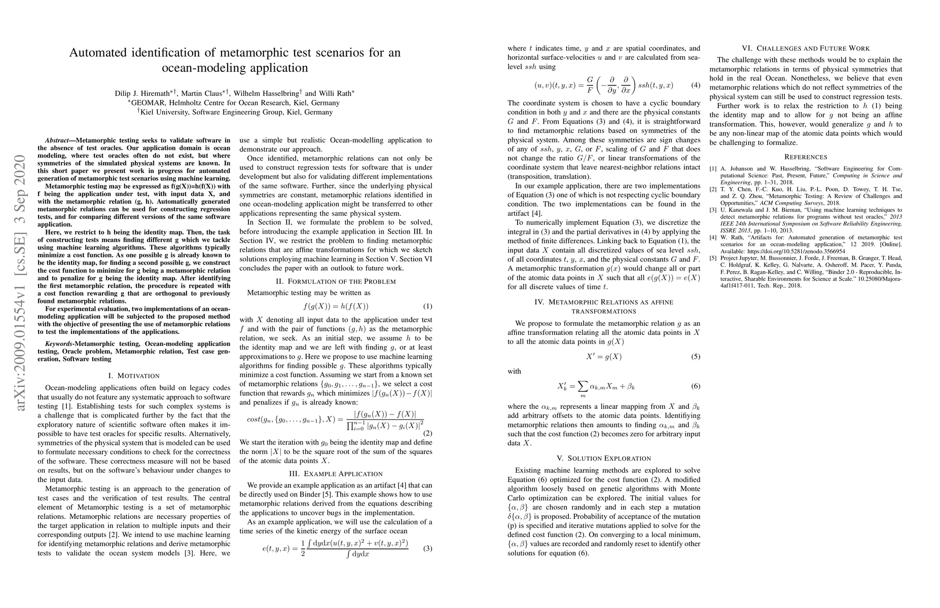 This paper presents ongoing work on using machine learning to automatically generate metamorphic test scenarios for ocean-modeling applications, where traditional test oracles are unavailable. The approach focuses on finding non-identity metamorphic relations to validate the software, employing cost functions to identify and prioritize novel transformations.