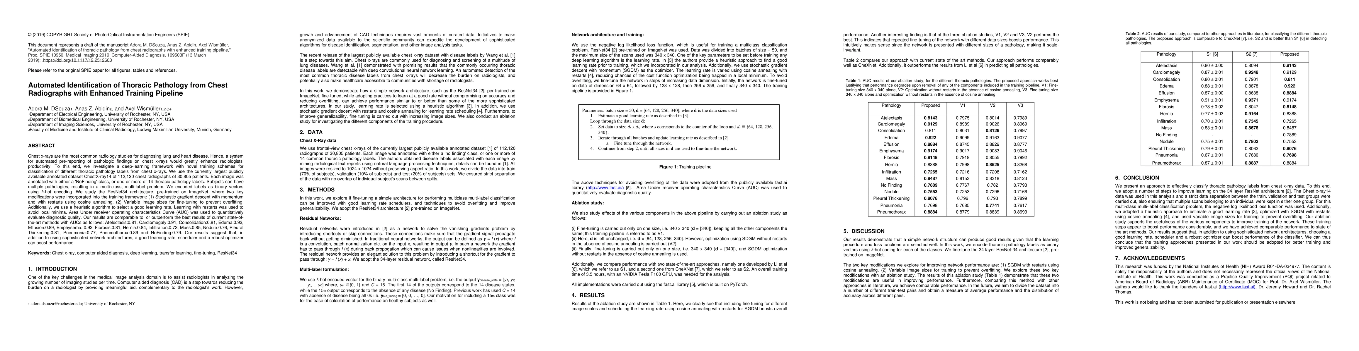 This paper proposes a deep-learning framework using a modified ResNet34 architecture for automated identification of thoracic pathologies from chest x-rays. The study employs novel training techniques, including a learning rate scheduler and variable image sizes, achieving competitive Area Under the Curve (AUC) scores across 14 pathology labels.