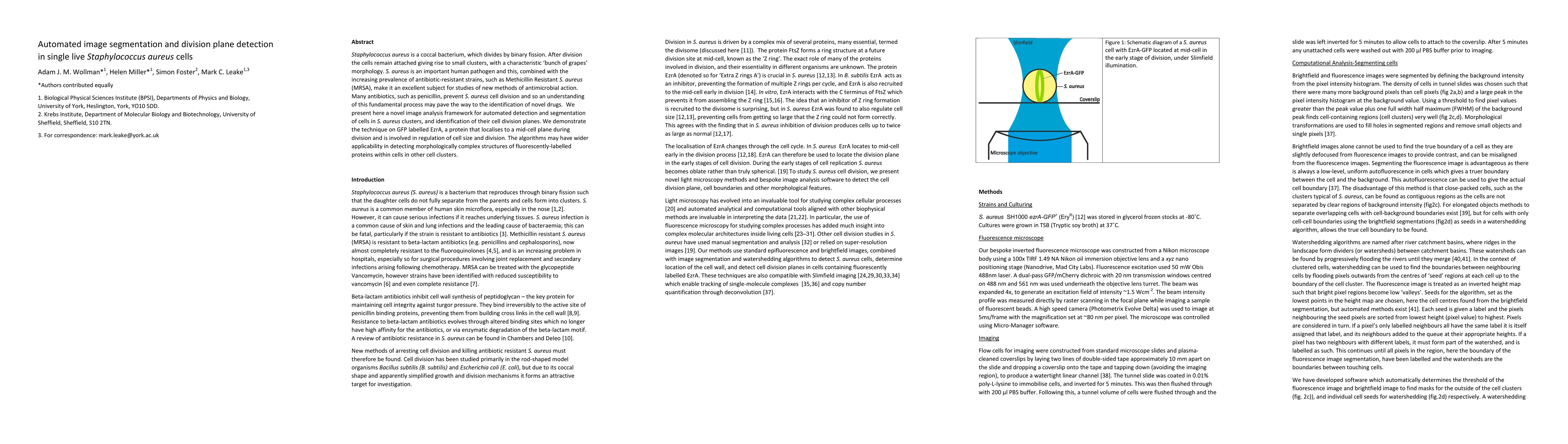 This paper introduces an automated image analysis framework for segmenting and detecting division planes in Staphylococcus aureus clusters, utilizing GFP-labelled EzrA protein localization. The method aims to advance understanding of bacterial cell division, potentially aiding in the development of novel antimicrobial strategies against antibiotic-resistant strains like MRSA.