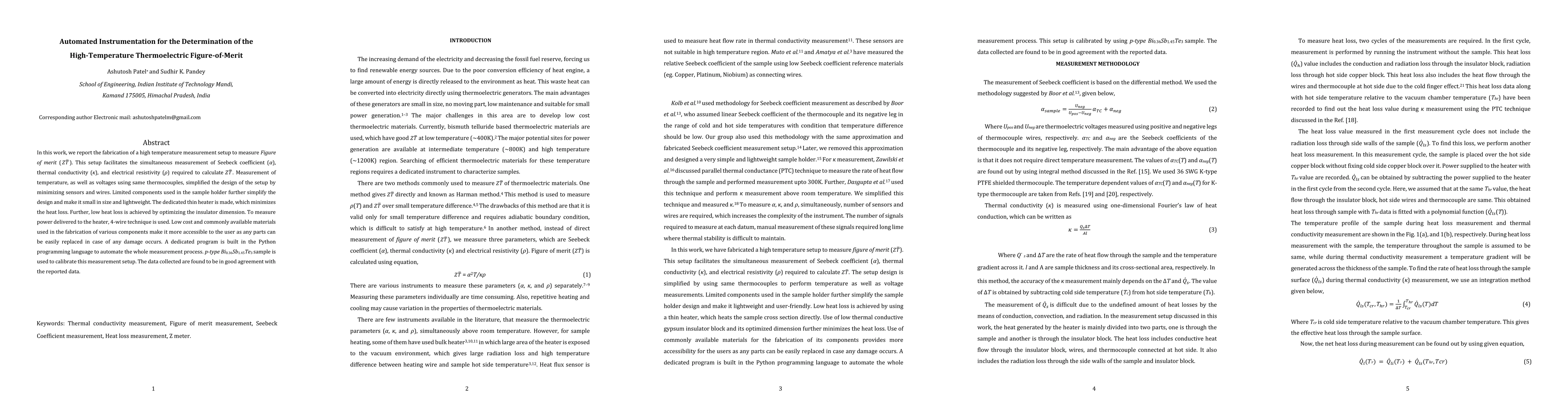 This paper presents an automated high-temperature measurement setup for determining the thermoelectric figure-of-merit (ZT) by simultaneously measuring Seebeck coefficient, thermal conductivity, and electrical resistivity. The design minimizes components and heat loss, and uses a dedicated Python program for automation.