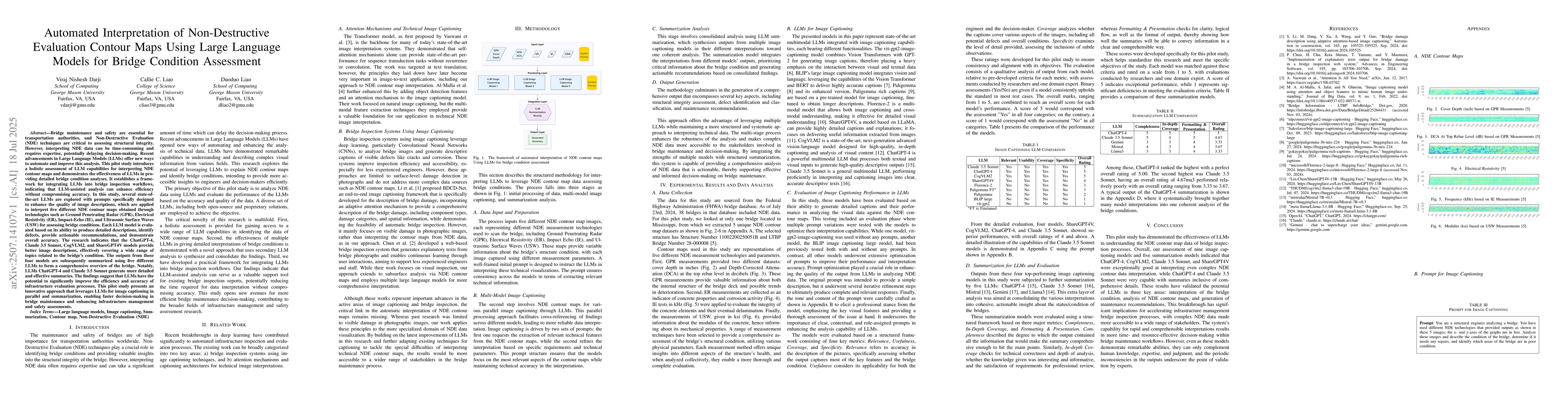 Bridge maintenance and safety are essential for transportation authorities, and Non-Destructive Evaluation (NDE) techniques are critical to assessing structural integrity. However, interpreting NDE data can be time-consuming and requires expertise, potentially delaying decision-making. Recent advancements in Large Language Models (LLMs) offer new ways to automate and improve this analysis. This pilot study introduces a holistic assessment of LLM capabilities for interpreting NDE contour maps and demonstrates the effectiveness of LLMs in providing detailed bridge condition analyses. It establishes a framework for integrating LLMs into bridge inspection workflows, indicating that LLM-assisted analysis can enhance efficiency without compromising accuracy. In this study, several LLMs are explored with prompts specifically designed to enhance the quality of image descriptions, which are applied to interpret five different NDE contour maps obtained through technologies for assessing bridge conditions. Each LLM model is evaluated based on its ability to produce detailed descriptions, identify defects, provide actionable recommendations, and demonstrate overall accuracy. The research indicates that four of the nine models provide better image descriptions, effectively covering a wide range of topics related to the bridge's condition. The outputs from these four models are summarized using five different LLMs to form a comprehensive overview of the bridge. Notably, LLMs ChatGPT-4 and Claude 3.5 Sonnet generate more effective summaries. The findings suggest that LLMs have the potential to significantly improve efficiency and accuracy. This pilot study presents an innovative approach that leverages LLMs for image captioning in parallel and summarization, enabling faster decision-making in bridge maintenance and enhancing infrastructure management and safety assessments.