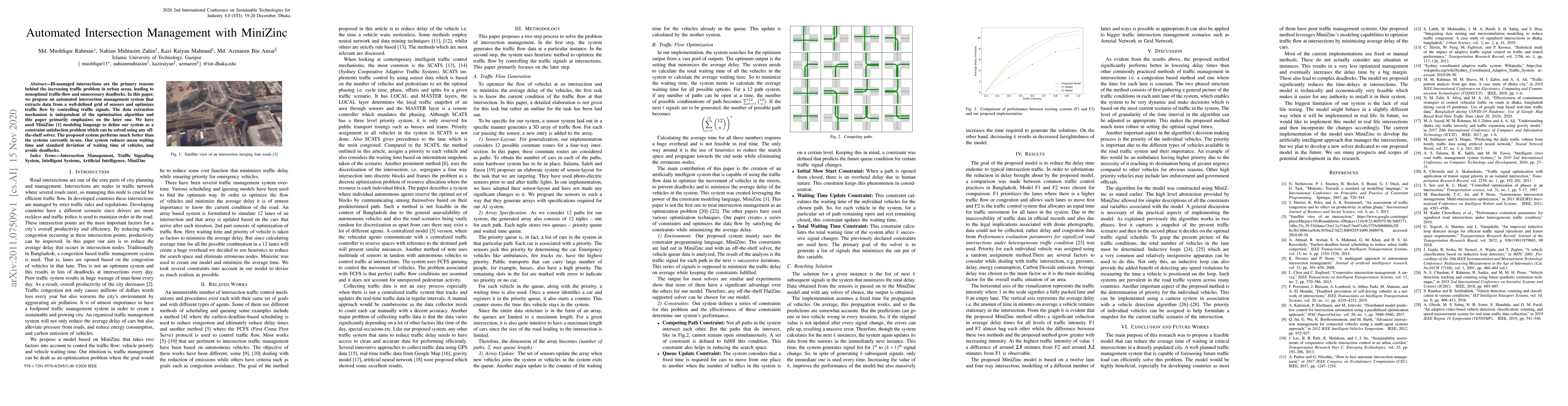 Ill-managed intersections are the primary reasons behind the increasing traffic problem in urban areas, leading to nonoptimal traffic-flow and unnecessary deadlocks. In this paper, we propose an automated intersection management system that extracts data from a well-defined grid of sensors and optimizes traffic flow by controlling traffic signals. The data extraction mechanism is independent of the optimization algorithm and this paper primarily emphasizes the later one. We have used MiniZinc modeling language to define our system as a constraint satisfaction problem which can be solved using any off-the-shelf solver. The proposed system performs much better than the systems currently in use. Our system reduces the mean waiting time and standard deviation of the waiting time of vehicles and avoids deadlocks.
