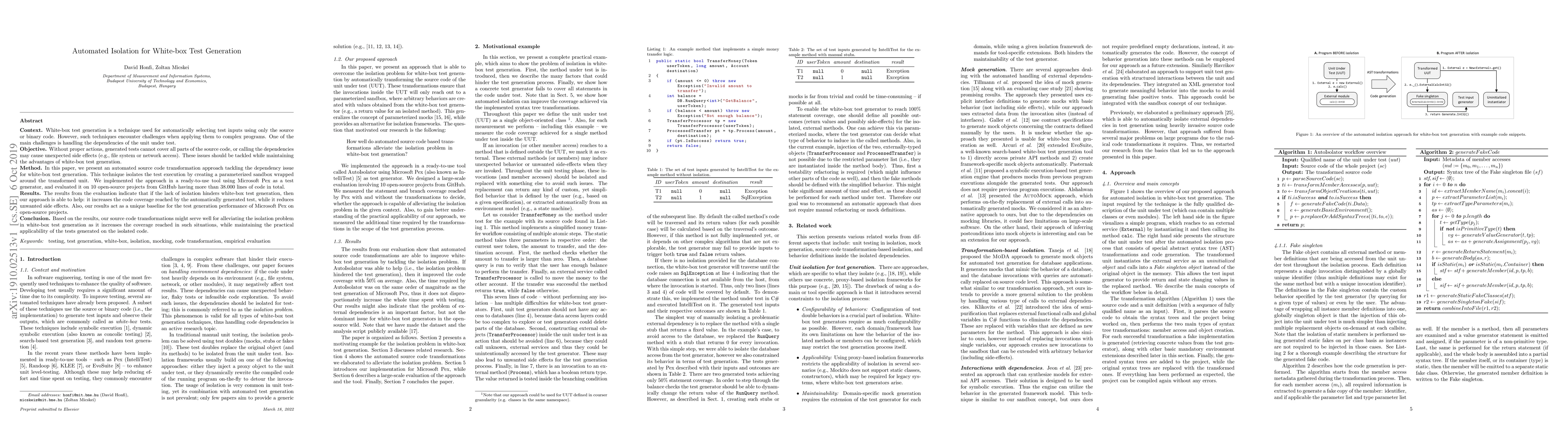 Context. White-box test generation is a technique used for automatically selecting test inputs using only the source or binary code. However, such techniques encounter challenges when applying them to complex programs. One of the main challenges is handling the dependencies of the unit under test. Objective. Without proper actions, generated tests cannot cover all parts of the source code, or calling the dependencies may cause unexpected side effects (e.g., file system or network access). These issues should be tackled while maintaining the advantages of white-box test generation. Method. In this paper, we present an automated source code transformation approach tackling the dependency issue for white-box test generation. This technique isolates the test execution by creating a parameterized sandbox wrapped around the transformed unit. We implemented the approach in a ready-to-use tool using Microsoft Pex as a test generator, and evaluated it on 10 open-source projects from GitHub having more than 38.000 lines of code in total. Results. The results from the evaluation indicate that if the lack of isolation hinders white-box test generation, then our approach is able to help: it increases the code coverage reached by the automatically generated test, while it reduces unwanted side effects. Also, our results act as a unique baseline for the test generation performance of Microsoft Pex on open-source projects. Conclusion. Based on the results, our source code transformations might serve well for alleviating the isolation problem in white-box test generation as it increases the coverage reached in such situations, while maintaining the practical applicability of the tests generated on the isolated code.