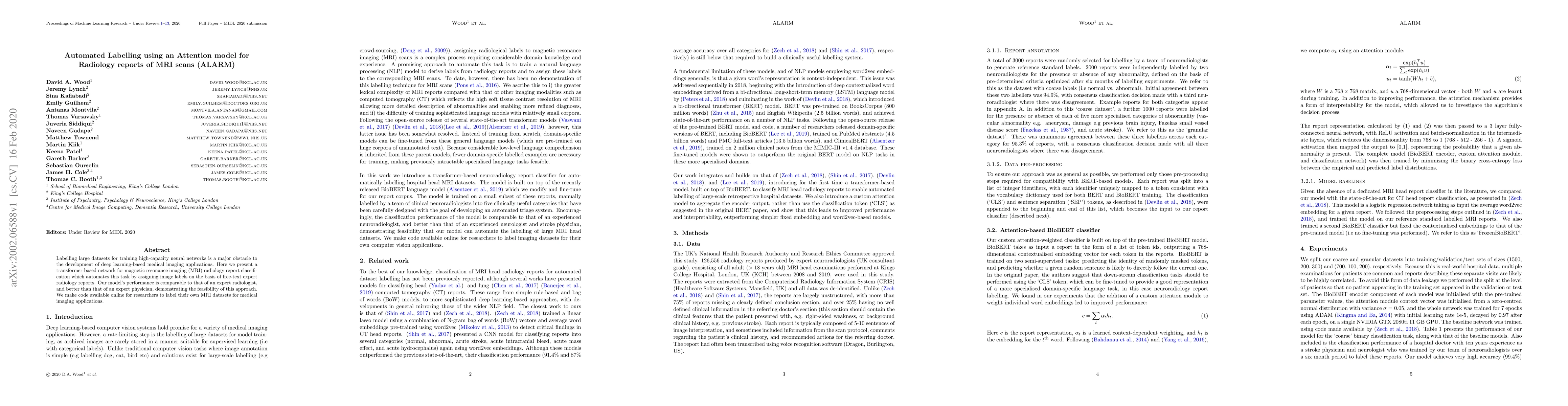 The paper introduces an attention-based transformer network for automating the labelling of MRI scans using expert radiology reports, achieving performance comparable to expert radiologists. The authors release code to facilitate similar labelling in other medical imaging datasets.
