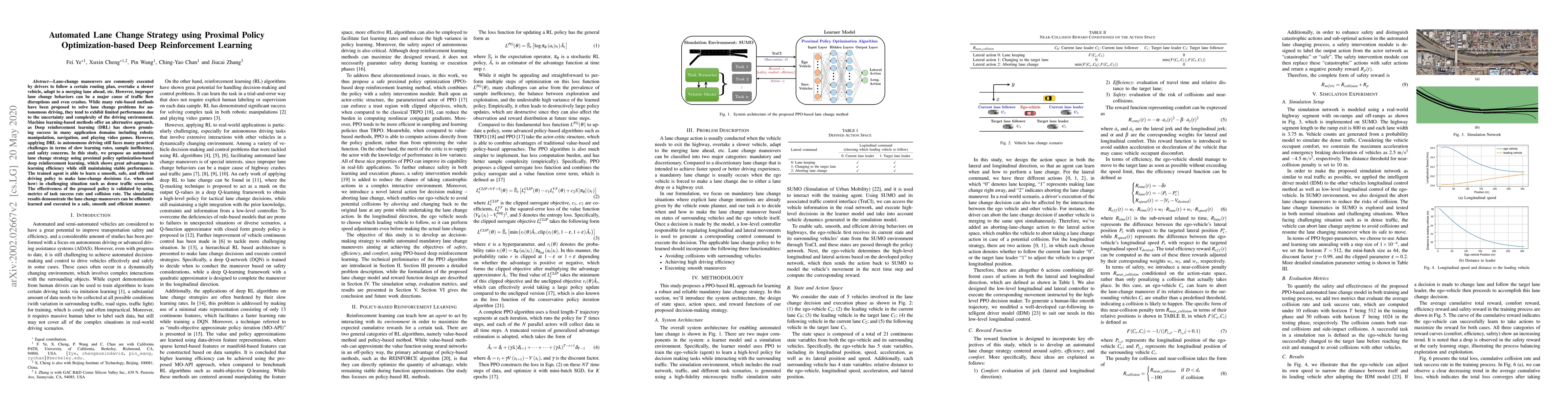 This paper proposes an automated lane change strategy using proximal policy optimization-based deep reinforcement learning to address the challenges of safe and efficient lane-changing maneuvers. The method demonstrates improved learning efficiency and stable performance, validated by task success and collision rates in simulations.