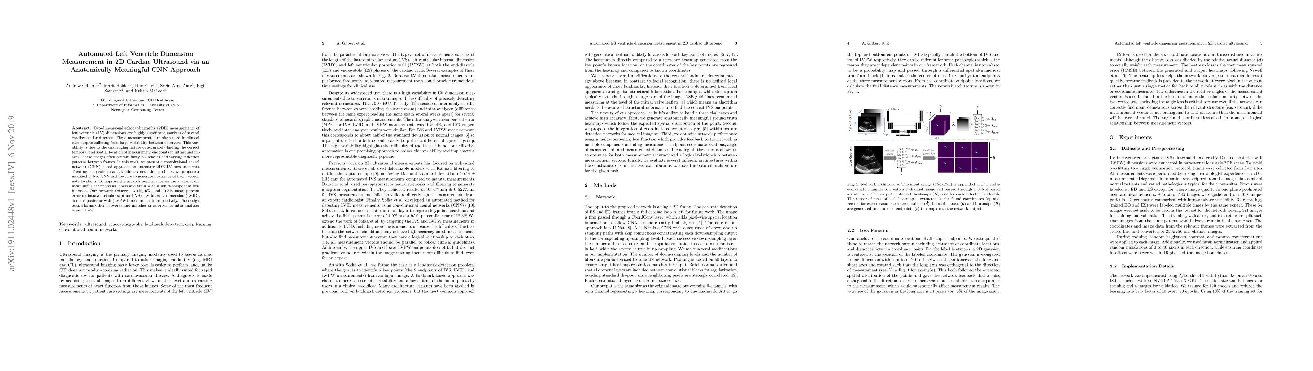 Two-dimensional echocardiography (2DE) measurements of left ventricle (LV) dimensions are highly significant markers of several cardiovascular diseases. These measurements are often used in clinical care despite suffering from large variability between observers. This variability is due to the challenging nature of accurately finding the correct temporal and spatial location of measurement endpoints in ultrasound images. These images often contain fuzzy boundaries and varying reflection patterns between frames. In this work, we present a convolutional neural network (CNN) based approach to automate 2DE LV measurements. Treating the problem as a landmark detection problem, we propose a modified U-Net CNN architecture to generate heatmaps of likely coordinate locations. To improve the network performance we use anatomically meaningful heatmaps as labels and train with a multi-component loss function. Our network achieves 13.4%, 6%, and 10.8% mean percent error on intraventricular septum (IVS), LV internal dimension (LVID), and LV posterior wall (LVPW) measurements respectively. The design outperforms other networks and matches or approaches intra-analyser expert error.