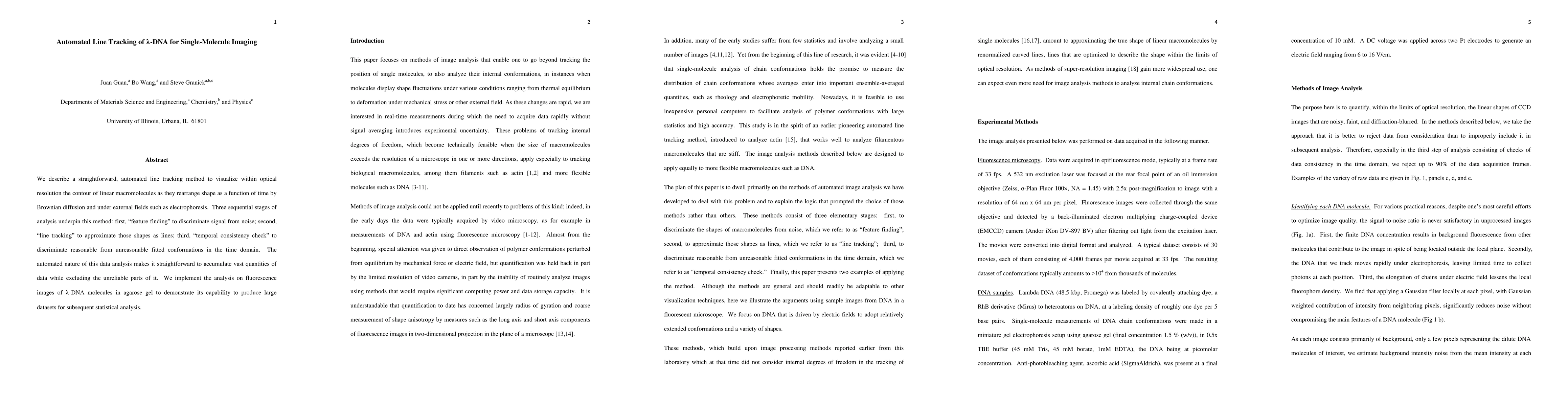 We describe a straightforward, automated line tracking method to visualize within optical resolution the contour of linear macromolecules as they rearrange shape as a function of time by Brownian diffusion and under external fields such as electrophoresis. Three sequential stages of analysis underpin this method: first, "feature finding" to discriminate signal from noise; second, "line tracking" to approximate those shapes as lines; third, "temporal consistency check" to discriminate reasonable from unreasonable fitted conformations in the time domain. The automated nature of this data analysis makes it straightforward to accumulate vast quantities of data while excluding the unreliable parts of it. We implement the analysis on fluorescence images of lambda-DNA molecules in agarose gel to demonstrate its capability to produce large datasets for subsequent statistical analysis.