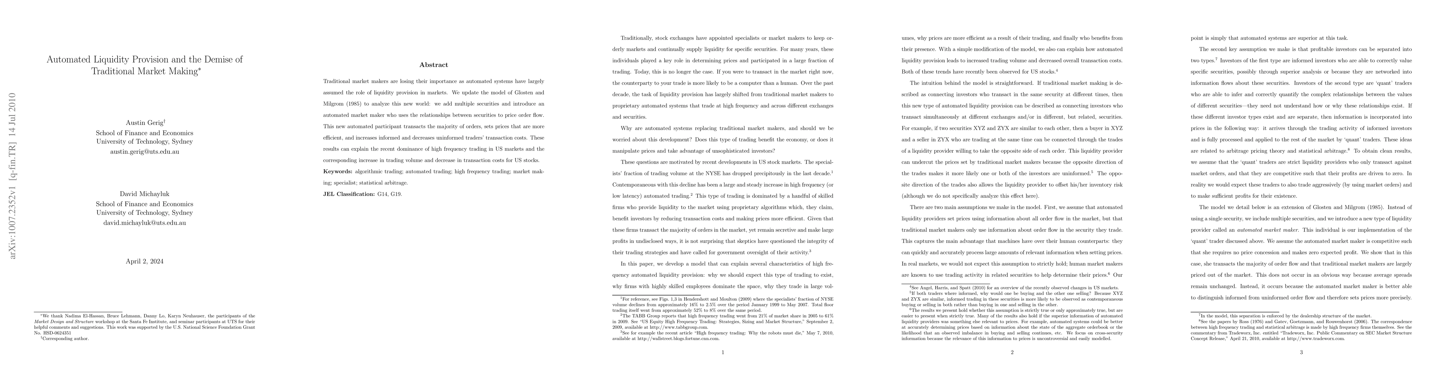 Title: Automated Liquidity Provision and the Demise of Traditional Market Making Summary: The paper updates the Glosten and Milgrom model to analyze the shift from traditional market makers to automated systems, showing that automated market makers now dominate liquidity provision, leading to more efficient pricing, increased trading volume, and reduced transaction costs for informed traders.