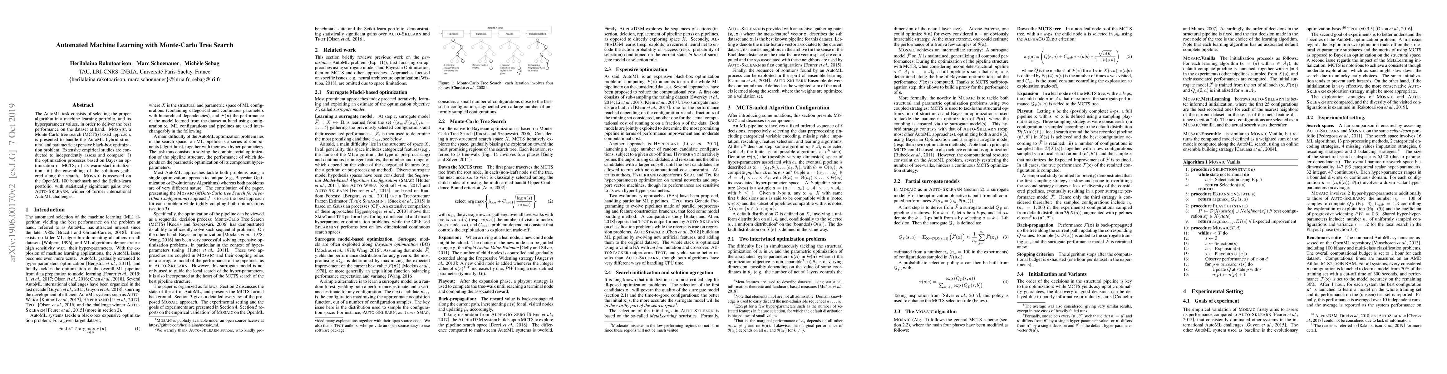 The AutoML task consists of selecting the proper algorithm in a machine learning portfolio, and its hyperparameter values, in order to deliver the best performance on the dataset at hand. Mosaic, a Monte-Carlo tree search (MCTS) based approach, is presented to handle the AutoML hybrid structural and parametric expensive black-box optimization problem. Extensive empirical studies are conducted to independently assess and compare: i) the optimization processes based on Bayesian optimization or MCTS; ii) its warm-start initialization; iii) the ensembling of the solutions gathered along the search. Mosaic is assessed on the OpenML 100 benchmark and the Scikit-learn portfolio, with statistically significant gains over Auto-Sklearn, winner of former international AutoML challenges.
