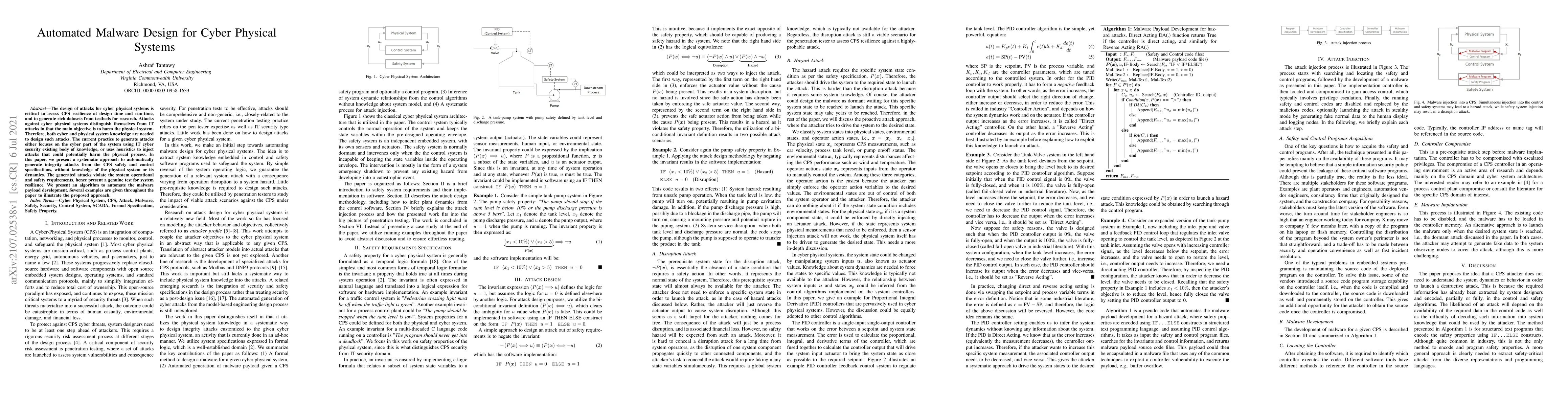 This paper proposes a systematic approach to automatically generate integrity attacks for cyber physical systems (CPS) based on safety and control specifications, without needing detailed knowledge of the physical system. The developed algorithm automates malware payload creation to test CPS resilience, providing a valuable method for generating test datasets for research.