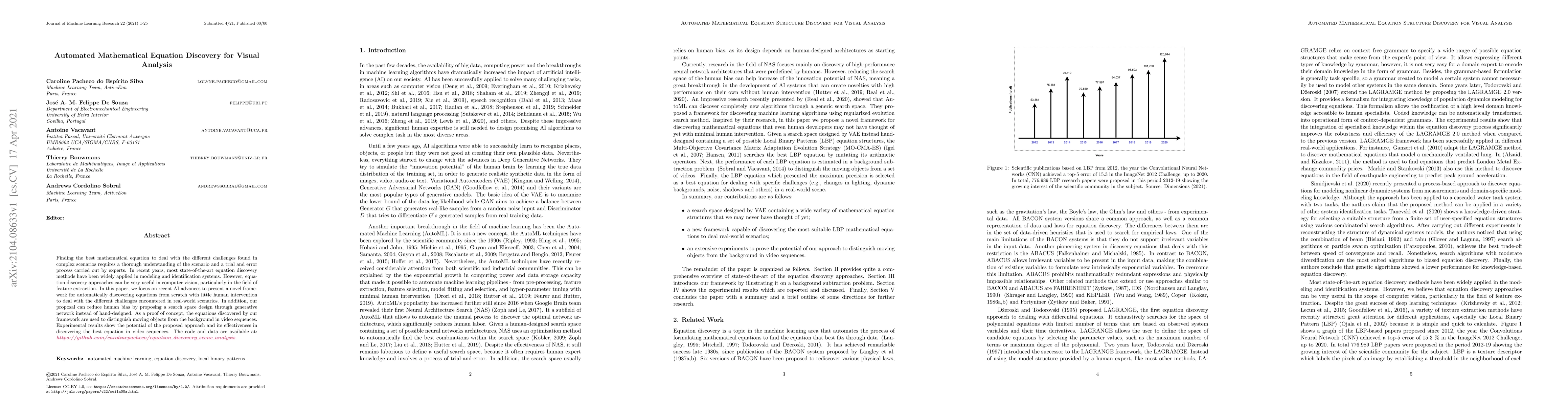 This paper introduces a novel AI framework for automatically discovering mathematical equations to model complex scenarios, reducing human bias and intervention. The framework uses generative networks to design search spaces and is demonstrated through its application in distinguishing moving objects from backgrounds in video sequences.