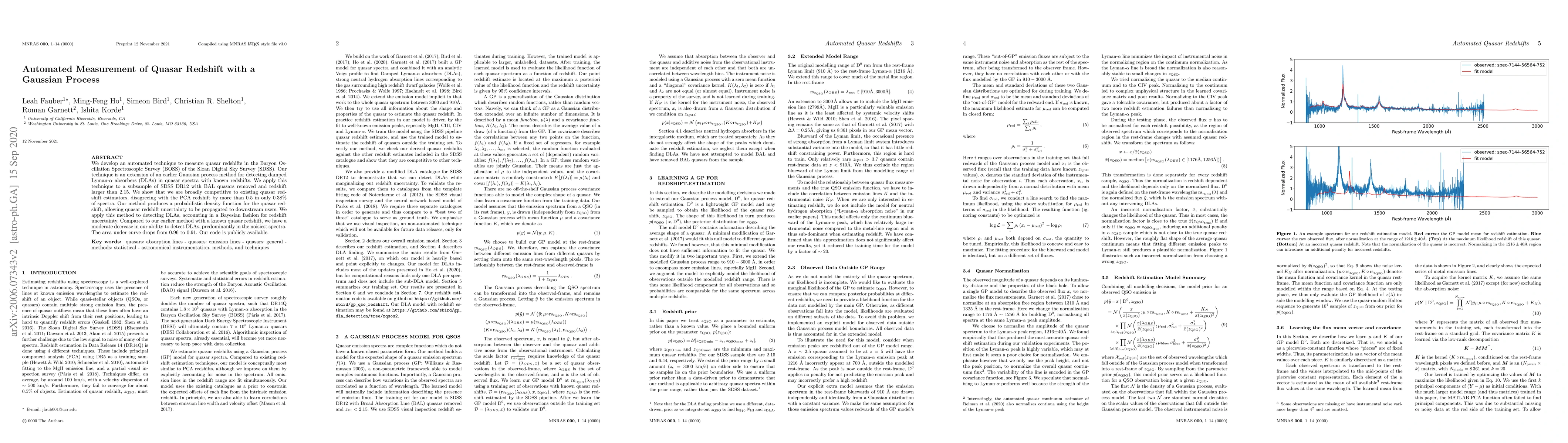 We develop an automated technique to measure quasar redshifts in the Baryon Oscillation Spectroscopic Survey (BOSS) of the Sloan Digital Sky Survey (SDSS). Our technique is an extension of an earlier Gaussian process method for detecting damped Lyman-alpha absorbers (DLAs) in quasar spectra with known redshifts. We apply this technique to a subsample of SDSS DR12 with BAL quasars removed and redshift larger than 2.15. We show that we are broadly competitive to existing quasar redshift estimators, disagreeing with the PCA redshift by more than 0.5 in only 0.38% of spectra. Our method produces a probabilistic density function for the quasar redshift, allowing quasar redshift uncertainty to be propagated to downstream users. We apply this method to detecting DLAs, accounting in a Bayesian fashion for redshift uncertainty. Compared to our earlier method with a known quasar redshift, we have a moderate decrease in our ability to detect DLAs, predominantly in the noisiest spectra. The area under curve drops from 0.96 to 0.91. Our code is publicly available.