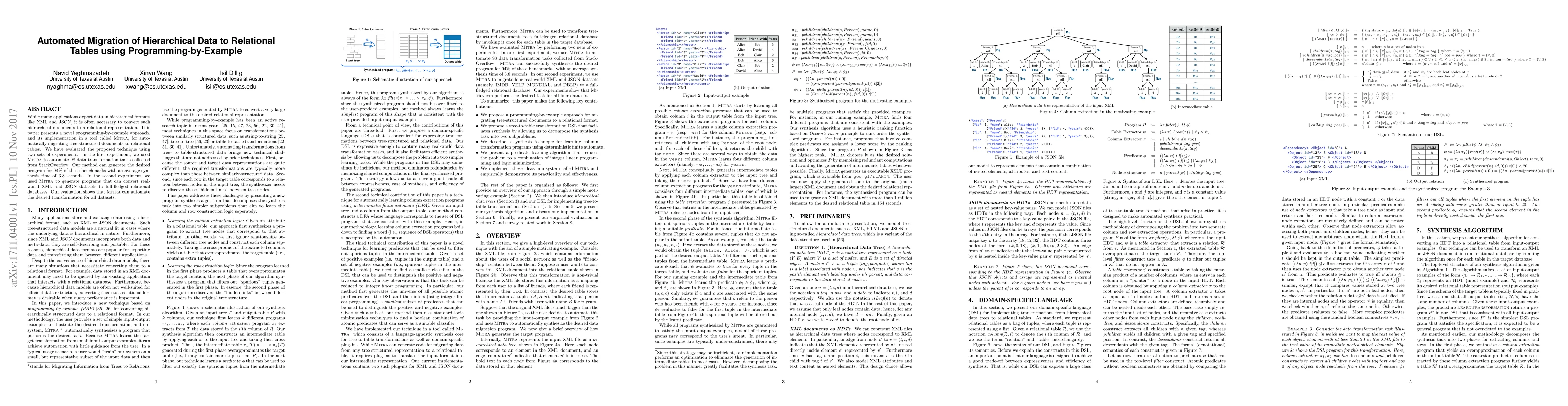 This paper introduces Mitra, a tool using programming-by-example to automatically convert tree-structured hierarchical data (like XML, JSON) into relational tables. It successfully generated programs for 94% of 98 StackOverflow tasks in 3.8 seconds on average, and effectively transformed real-world XML and JSON datasets into full-fledged relational databases in the second experiment.