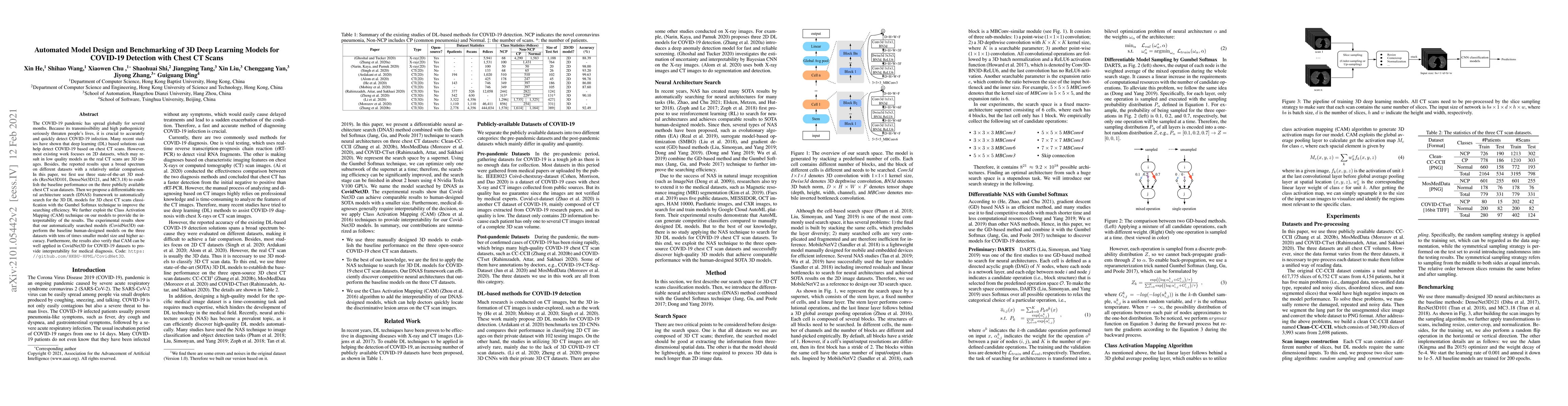 This paper presents an automated model design and benchmarking of 3D deep learning models for COVID-19 detection using chest CT scans, proposing a differentiable neural architecture search framework to improve model efficiency and accuracy. The results show that the automatically searched models outperform baseline models, with enhanced interpretability provided by Class Activation Mapping.