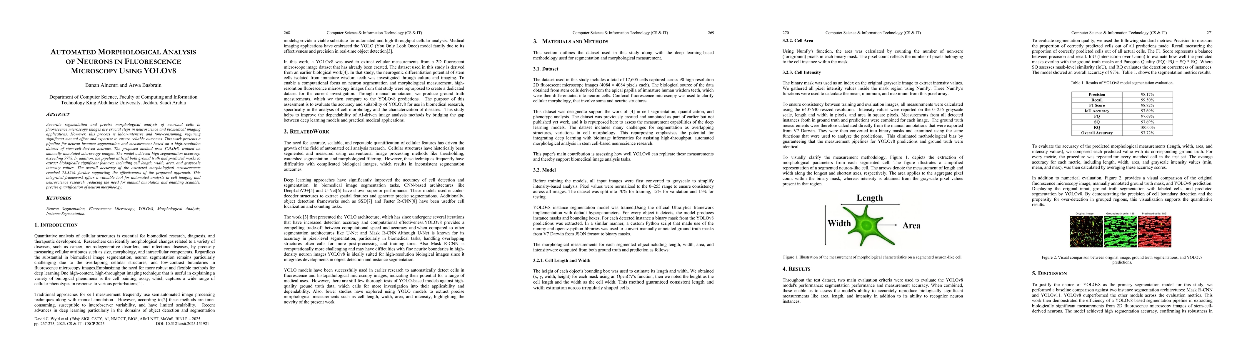 The study employed YOLOv8 for instance segmentation of neurons in fluorescence microscopy images, using a manually annotated dataset of stem-cell-derived neurons. Morphological measurements were extracted from both ground truth and predicted masks using OpenCV and NumPy.