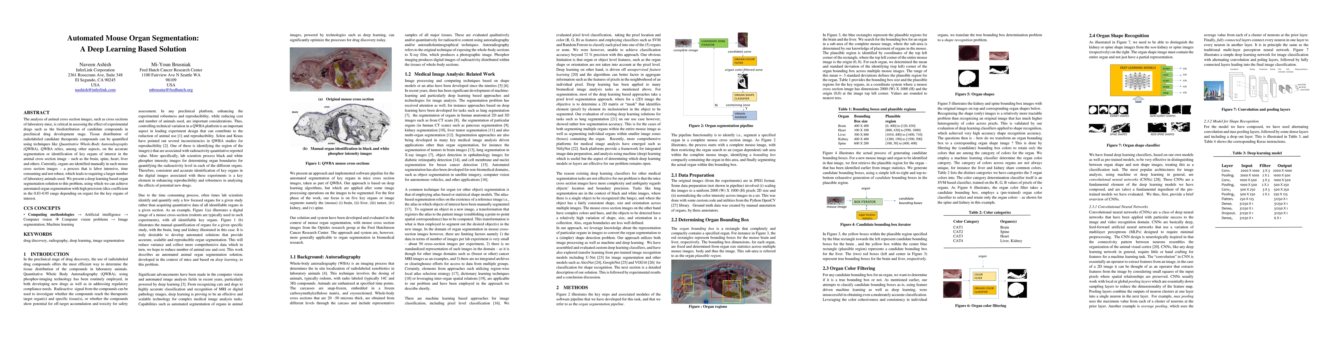 The analysis of animal cross section images, such as cross sections of laboratory mice, is critical in assessing the effect of experimental drugs such as the biodistribution of candidate compounds in preclinical drug development stage. Tissue distribution of radiolabeled candidate therapeutic compounds can be quantified using techniques like Quantitative Whole-Body Autoradiography (QWBA).QWBA relies, among other aspects, on the accurate segmentation or identification of key organs of interest in the animal cross section image such as the brain, spine, heart, liver and others. We present a deep learning based organ segmentation solution to this problem, using which we can achieve automated organ segmentation with high precision (dice coefficient in the 0.83-0.95 range depending on organ) for the key organs of interest.