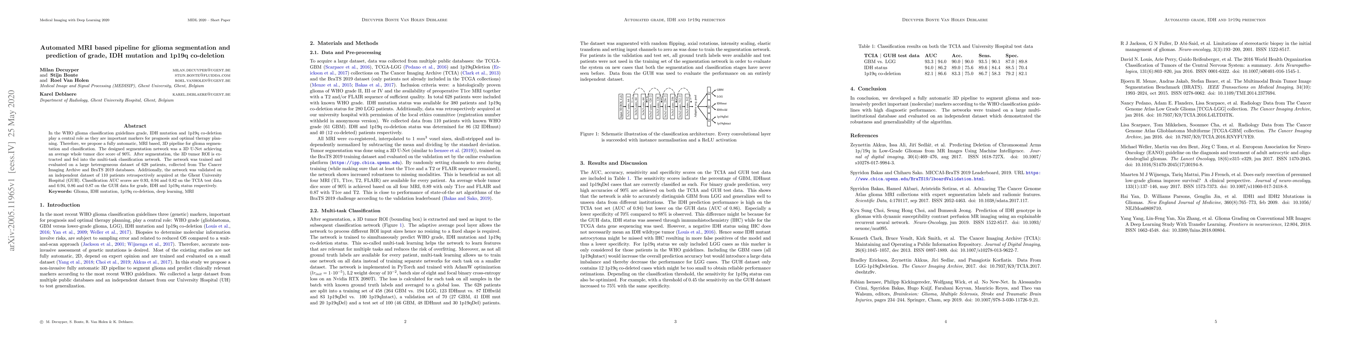 This paper presents a fully automatic MRI-based 3D pipeline using a 3D U-Net for glioma segmentation and multi-task classification to predict grade, IDH mutation, and 1p19q co-deletion. The network achieved high segmentation accuracy and robust classification performance on both TCIA and GUH datasets.