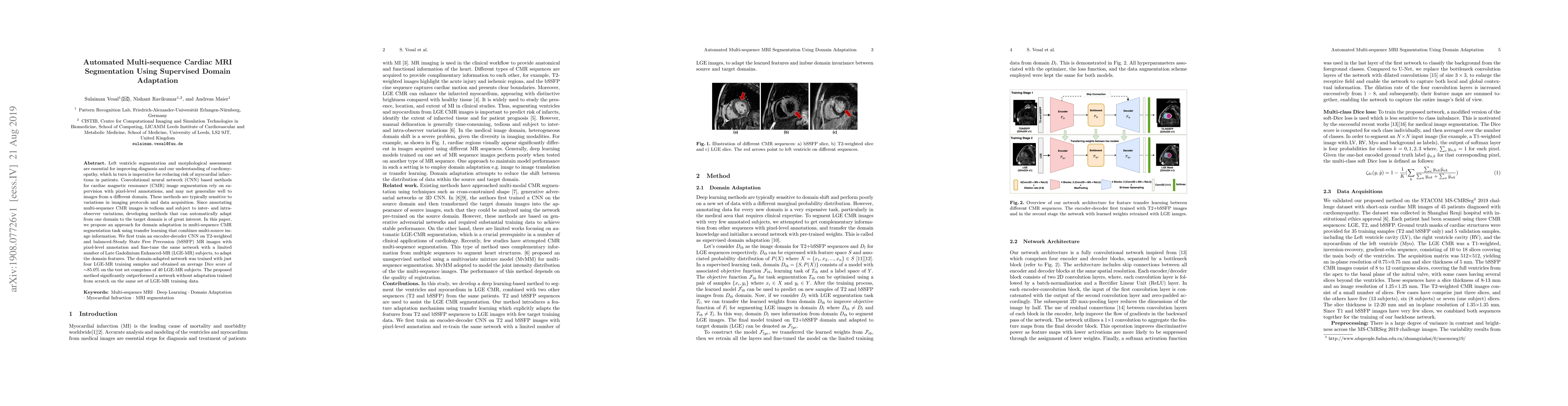This paper proposes a supervised domain adaptation method using transfer learning for automated segmentation of multi-sequence cardiac MRI, achieving an average Dice score of ~85% on LGE-MR test data. The approach fine-tunes a CNN trained on T2-weighted and bSSFP images with limited LGE-MR data, significantly outperforming a network trained from scratch on LGE-MR data alone.
