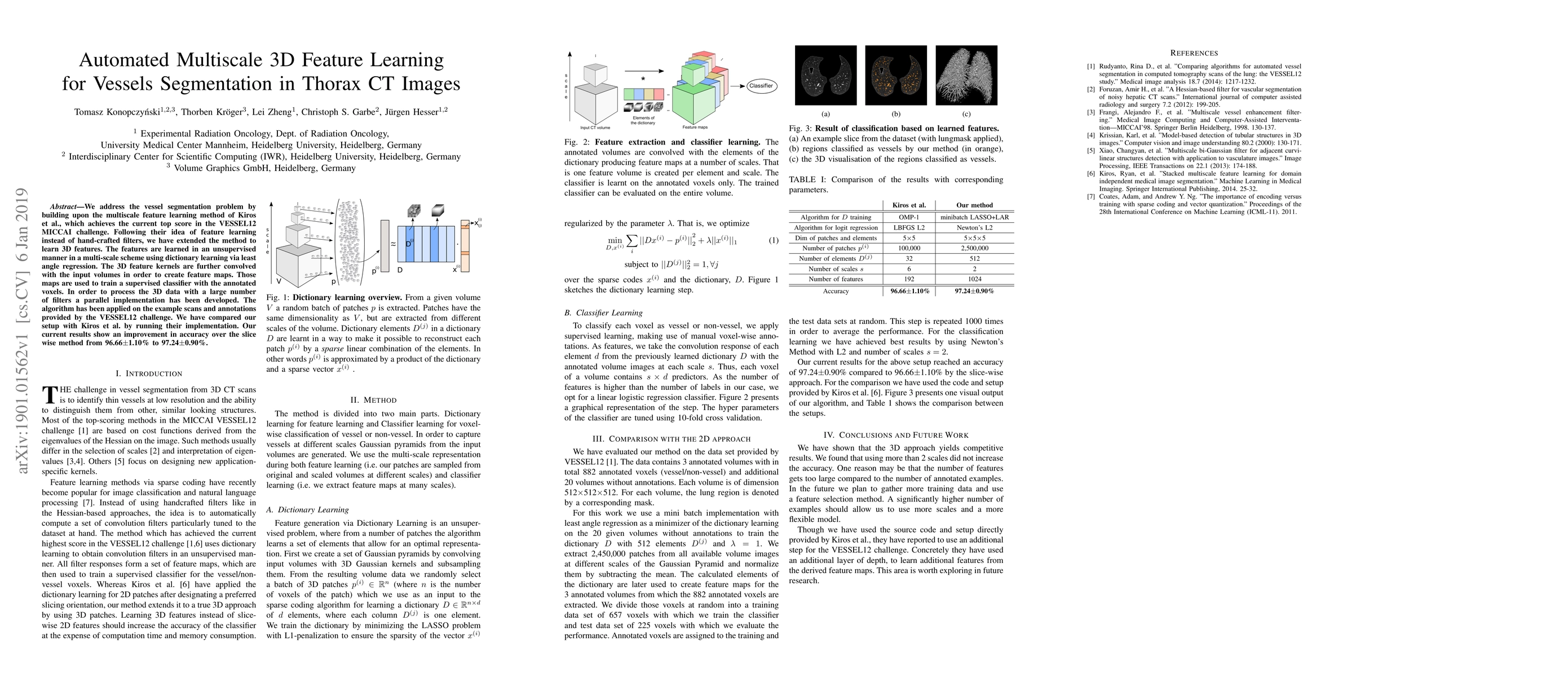 We address the vessel segmentation problem by building upon the multiscale feature learning method of Kiros et al., which achieves the current top score in the VESSEL12 MICCAI challenge. Following their idea of feature learning instead of hand-crafted filters, we have extended the method to learn 3D features. The features are learned in an unsupervised manner in a multi-scale scheme using dictionary learning via least angle regression. The 3D feature kernels are further convolved with the input volumes in order to create feature maps. Those maps are used to train a supervised classifier with the annotated voxels. In order to process the 3D data with a large number of filters a parallel implementation has been developed. The algorithm has been applied on the example scans and annotations provided by the VESSEL12 challenge. We have compared our setup with Kiros et al. by running their implementation. Our current results show an improvement in accuracy over the slice wise method from 96.66$\pm$1.10% to 97.24$\pm$0.90%.