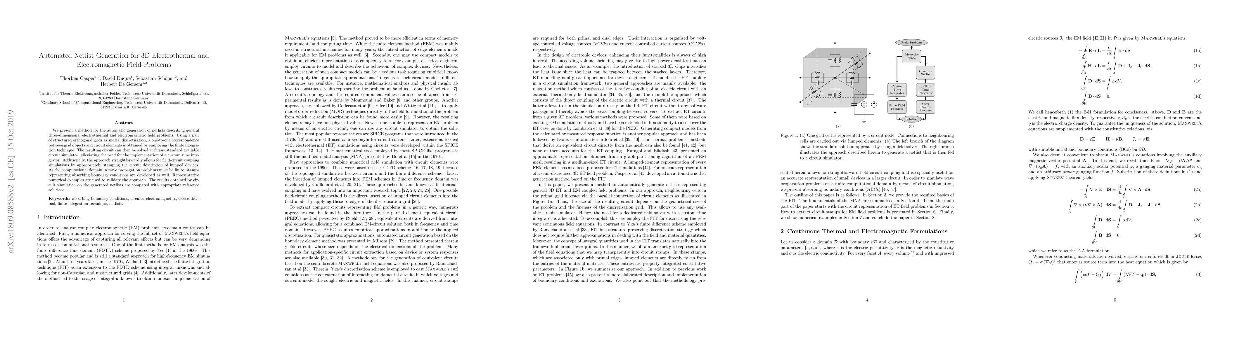 This paper introduces an automated method for generating netlists for 3D electrothermal and electromagnetic field problems using structured orthogonal grids and finite integration technique. The approach facilitates field-circuit coupling simulations and includes absorbing boundary conditions for finite domains, validated through representative numerical examples.