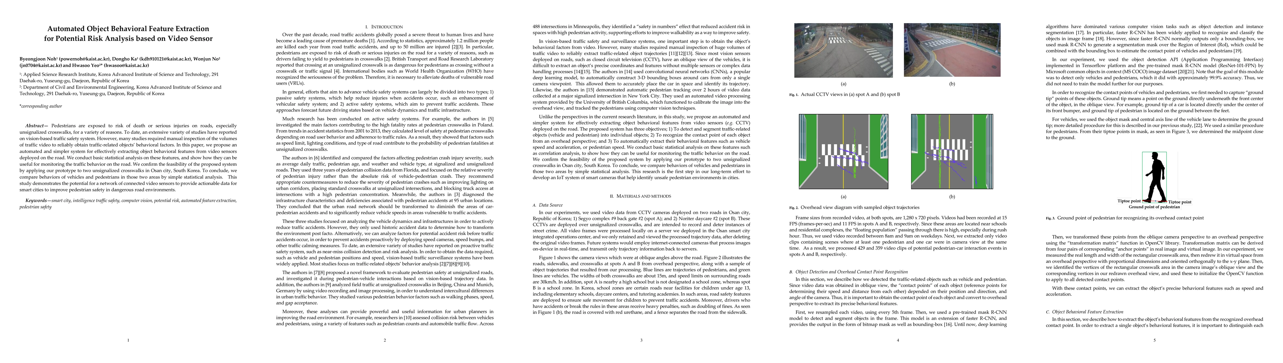 Pedestrians are exposed to risk of death or serious injuries on roads, especially unsignalized crosswalks, for a variety of reasons. To date, an extensive variety of studies have reported on vision based traffic safety system. However, many studies required manual inspection of the volumes of traffic video to reliably obtain traffic related objects behavioral factors. In this paper, we propose an automated and simpler system for effectively extracting object behavioral features from video sensors deployed on the road. We conduct basic statistical analysis on these features, and show how they can be useful for monitoring the traffic behavior on the road. We confirm the feasibility of the proposed system by applying our prototype to two unsignalized crosswalks in Osan city, South Korea. To conclude, we compare behaviors of vehicles and pedestrians in those two areas by simple statistical analysis. This study demonstrates the potential for a network of connected video sensors to provide actionable data for smart cities to improve pedestrian safety in dangerous road environments.