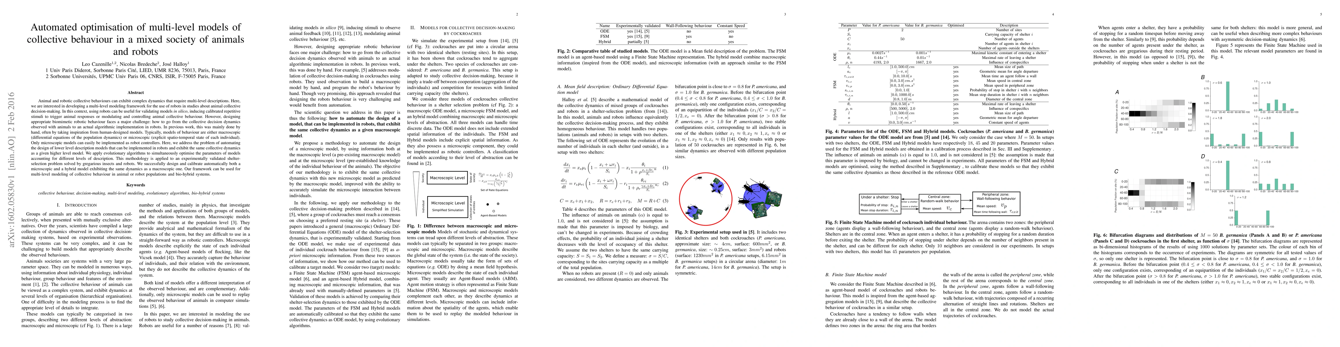 Animal and robotic collective behaviours can exhibit complex dynamics that require multi-level descriptions. Here, we are interested in developing a multi-level modeling framework for the use of robots in studies about animal collective decision-making. In this context, using robots can be useful for validating models in silico, inducing calibrated repetitive stimuli to trigger animal responses or modulating and controlling animal collective behaviour. However, designing appropriate biomimetic robotic behaviour faces a major challenge: how to go from the collective decision dynamics observed with animals to an actual algorithmic implementation in robots. In previous work, this was mainly done by hand, often by taking inspiration from human-designed models. Typically, models of behaviour are either macroscopic, differential equations of the population dynamics, or microscopic,explicit spatio-temporal state of each individual. Only microscopic models can easily be implemented as robot controllers. Here, we address the problem of automating the design of lower level description models that can be implemented in robots and exhibit the same collective dynamics as a given higher level model. We apply evolutionary algorithms to simultaneously optimise the parameters of models accounting for different levels of description. This methodology is applied to an experimentally validated shelter-selection problem solved by gregarious insects and robots. We successfully design and calibrate automatically both a microscopic and a hybrid model exhibiting the same dynamics as a macroscopic one. Our framework can be used for multi-level modeling of collective behaviour in animal or robot populations and bio-hybrid systems.