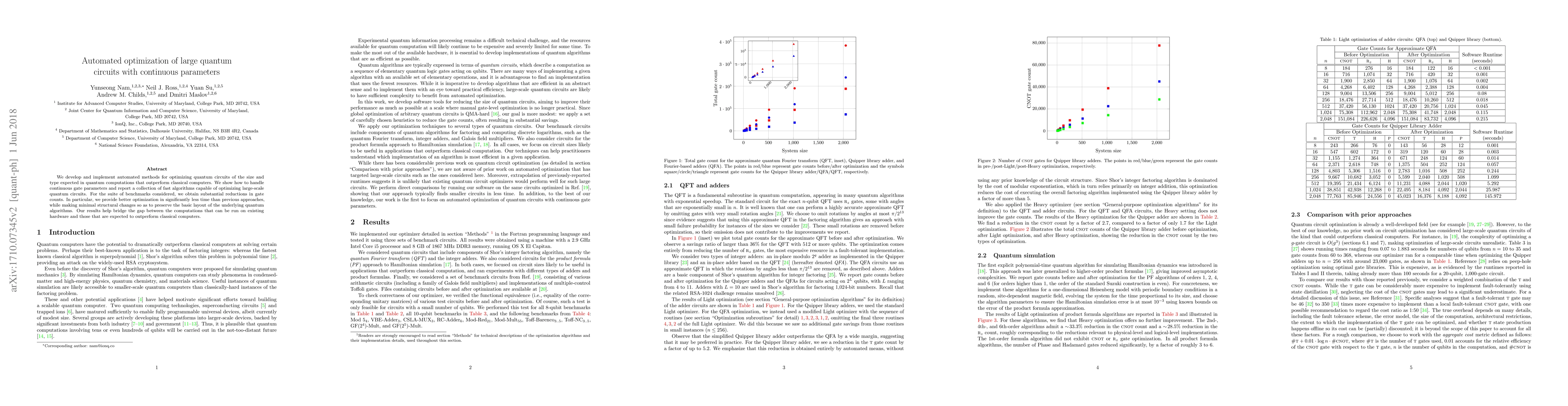 This paper presents automated optimization techniques for large quantum circuits with continuous gate parameters, achieving significant reductions in gate counts and computational time compared to previous methods, thereby aiding the transition to quantum advantage. The proposed algorithms maintain the original structure of quantum algorithms while enhancing their efficiency.