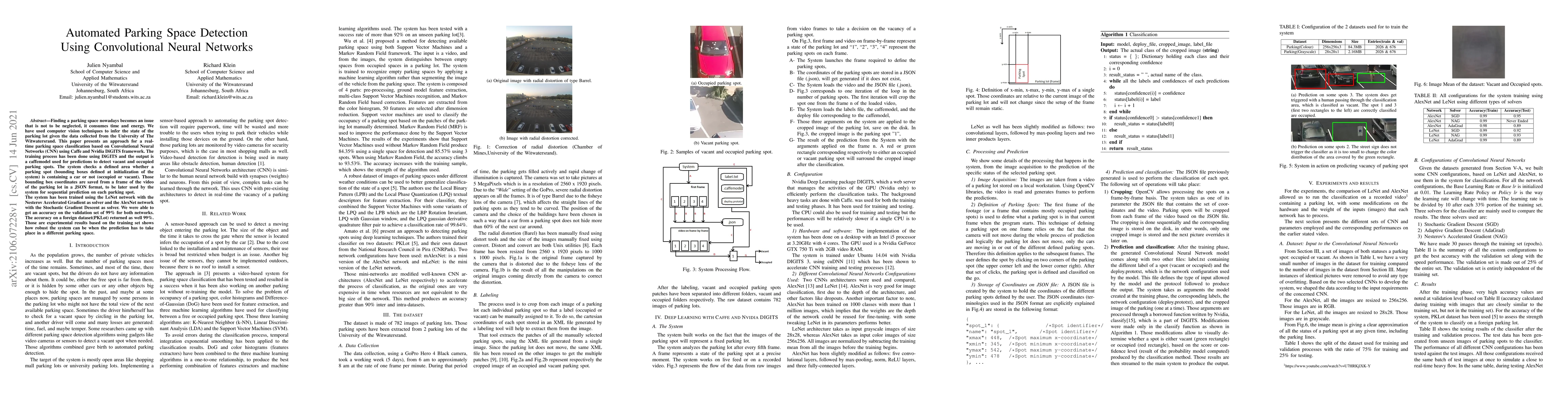 Finding a parking space nowadays becomes an issue that is not to be neglected, it consumes time and energy. We have used computer vision techniques to infer the state of the parking lot given the data collected from the University of The Witwatersrand. This paper presents an approach for a real-time parking space classification based on Convolutional Neural Networks (CNN) using Caffe and Nvidia DiGITS framework. The training process has been done using DiGITS and the output is a caffemodel used for predictions to detect vacant and occupied parking spots. The system checks a defined area whether a parking spot (bounding boxes defined at initialization of the system) is containing a car or not (occupied or vacant). Those bounding box coordinates are saved from a frame of the video of the parking lot in a JSON format, to be later used by the system for sequential prediction on each parking spot. The system has been trained using the LeNet network with the Nesterov Accelerated Gradient as solver and the AlexNet network with the Stochastic Gradient Descent as solver. We were able to get an accuracy on the validation set of 99\% for both networks. The accuracy on a foreign dataset(PKLot) returned as well 99\%. Those are experimental results based on the training set shows how robust the system can be when the prediction has to take place in a different parking space.