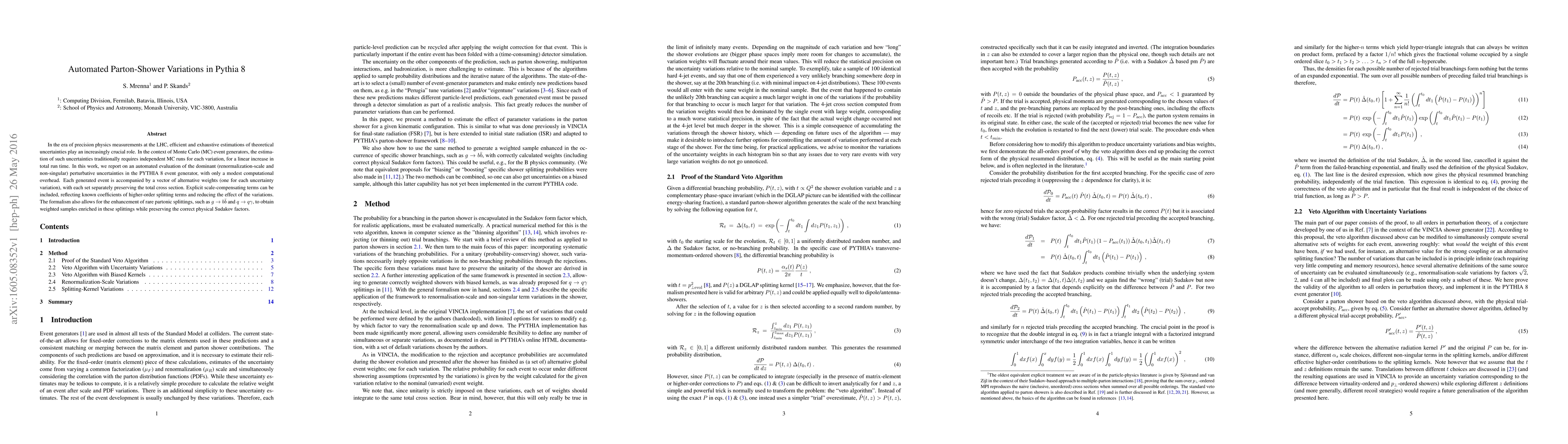 In the era of precision physics measurements at the LHC, efficient and exhaustive estimations of theoretical uncertainties play an increasingly crucial role. In the context of Monte Carlo (MC) event generators, the estimation of such uncertainties traditionally requires independent MC runs for each variation, for a linear increase in total run time. In this work, we report on an automated evaluation of the dominant (renormalization-scale and non-singular) perturbative uncertainties in the PYTHIA 8 event generator, with only a modest computational overhead. Each generated event is accompanied by a vector of alternative weights (one for each uncertainty variation), with each set separately preserving the total cross section. Explicit scale-compensating terms can be included, reflecting known coefficients of higher-order splitting terms and reducing the effect of the variations. The formalism also allows for the enhancement of rare partonic splittings, such as $g \to b \bar{b}$ and $q\to q \gamma$, to obtain weighted samples enriched in these splittings while preserving the correct physical Sudakov factors.